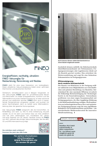 F%u00fcr weitere Informationen: info@fineoglass.euwww.fineoglass.eu Wir beraten Sie gerne!Energieeffizient, nachhaltig, ultrad%u00fcnn:FINEO Vakuumglas f%u00fcr Restaurierung, Renovierung und Neubau Sie m%u00f6chten mehr erfahren? Scannen Sie jetzt den QR-Code.FINEO steht f%u00fcr eine neue Generation von Isoliergl%u00e4sern. Diese ultrad%u00fcnne Vakuumverglasung bietet einen optimalen thermischen und akustischen Komfort.%u00c4sthetisch, klimafreundlich und in Belgien hergestellt, ist das Vakuumglas FINEO ideal f%u00fcr umweltbewusstes Bauen und Renovieren. Es bietet Energieeffizienz, Komfort und die W%u00e4rmed%u00e4mmung einer Dreifachverglasung, ist aber sechsmal d%u00fcnner und wesentlich leichter. FINEO kann auch in bestehende Fensterrahmen eingesetzt werden und punktet mit seiner Nachhaltigkeit, denn es beh%u00e4lt seine W%u00e4rmed%u00e4mmleistung %u00fcber die gesamte Nutzungsdauer.Das Vakuumglas FINEO entspricht den EU-Vorschriften, ist f%u00f6rderf%u00e4hig und kann zu 100 % ohne Entkernung recycelt werden. Es ist mit dem Low-Carbon Glas von AGC erh%u00e4ltlich und hat eine Lebensdauer von mindestens 60 Jahren und eine Garantie von 20 Jahren. Dar%u00fcber hinaus ist FINEOvon AGC weltweit das einzige Vakuumisolierglas, das die aBG, CE und EPD-Kennzeichnung tr%u00e4gt.F%u00fcr weitere Informationen: info@fineoglass.euwww.fineoglass.eu Wir beraten Sie gerne!Energieeffizient, nachhaltig, ultrad%u00fcnn:FINEO Vakuumglas f%u00fcr Restaurierung, Renovierung und Neubau Sie m%u00f6chten mehr erfahren? Scannen Sie jetzt den QR-Code.FINEO steht f%u00fcr eine neue Generation von Isoliergl%u00e4sern. Diese ultrad%u00fcnne Vakuumverglasung bietet einen optimalen thermischen und akustischen Komfort.%u00c4sthetisch, klimafreundlich und in Belgien hergestellt, ist das Vakuumglas FINEO ideal f%u00fcr umweltbewusstes Bauen und Renovieren. Es bietet Energieeffizienz, Komfort und die W%u00e4rmed%u00e4mmung einer Dreifachverglasung, ist aber sechsmal d%u00fcnner und wesentlich leichter. FINEO kann auch in bestehende Fensterrahmen eingesetzt werden und punktet mit seiner Nachhaltigkeit, denn es beh%u00e4lt seine W%u00e4rmed%u00e4mmleistung %u00fcber die gesamte Nutzungsdauer.Das Vakuumglas FINEO entspricht den EU-Vorschriften, ist f%u00f6rderf%u00e4hig und kann zu 100 % ohne Entkernung recycelt werden. Es ist mit dem Low-Carbon Glas von AGC erh%u00e4ltlich und hat eine Lebensdauer von mindestens 60 Jahren und eine Garantie von 20 Jahren. Dar%u00fcber hinaus ist FINEOvon AGC weltweit das einzige Vakuumisolierglas, das die aBG, CE und EPD-Kennzeichnung tr%u00e4gt.Zus%u00e4tzlich k%u00f6nnen mithilfe der Rohrlasertechnik Identifikationsmerkmale wie Teilenummern, Fertigungsanweisungen oder Lagehinweise direkt auf die Bauteile graviert werden. Dies erleichtert die Weiterverarbeitung und sorgt f%u00fcr eine l%u00fcckenlose Dokumentation im Fertigungsprozess.Effizienzsteigerung durch moderne RohrlasertechnikDer Einsatz von Rohrlasern in der Fertigung er%u00f6ffnet zahlreiche neue M%u00f6glichkeiten zur wirtschaftlichen und pr%u00e4zisen Herstellung von Bauteilen. Entscheidend f%u00fcr eine maximale Effizienz ist jedoch die fr%u00fchzeitige Ber%u00fccksichtigung der Technologie bereits in der Konstruktionsphase. Unternehmen profitieren von einer engen Zusammenarbeit mit Fertigungspartnern, die %u00fcber langj%u00e4hrige Erfahrung in der Rohrlaserbearbeitung verf%u00fcgen. Die Kombination aus technologischem Know-how und optimierten Fertigungsprozessen sorgt f%u00fcr eine signifikante Reduktion von Produktionszeiten und Kosten %u2013 ein entscheidender Wettbewerbsvorteil f%u00fcr innovative Metallverarbeitung. yKONTAKTMetallbau Nick GmbHIndustriestra%u00dfe 1668623 LampertheimTel. +49 (0)6206 94370info@nick-gmbh.dewww.nick-gmbh.deAuch Gravuren k%u00f6nnen mittels Rohrlasertechnik an einem Bauteil eingebracht werden05|25