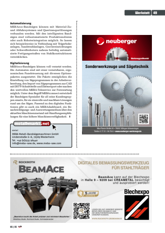 KONTAKTMEBA Metall-Bands%u00e4gemaschinen GmbHLindenstra%u00dfe 6-8, 72589 WesterheimTel. +49 (0)7333 96440info@meba-saw.de, www.meba-saw.comAutomatisierungMEBAeco-Bands%u00e4gen k%u00f6nnen mit Material-Zuund Abfuhrsystemen und Quertransportl%u00f6sungen verbunden werden. Mit den intelligenten Bands%u00e4gen sind vollautomatisierte Produktionslinien oder auch Roboterintegration m%u00f6glich. So lassen sich beispielsweise in Verbindung mit Tr%u00e4gerbohranlagen, Sandstrahlanlagen, Graviereinrichtungen oder Schwei%u00dfrobotern nahezu beliebig automatisierte Fertigungsstra%u00dfen von Stahlkonstruktionen verwirklichen. DigitalisierungMEBAeco-Bands%u00e4gen k%u00f6nnen voll vernetzt werden. Die Automaten sind mit einer vernetzbaren, ergonomischen Panelsteuerung mit diversen Optionspaketen ausgestattet. Die Pakete erm%u00f6glichen die Einstellung von S%u00e4geprogrammen in der Arbeitsvorbereitung, den Import von S%u00e4geprogrammen aus CAD mit DSTV-Schnittstelle und Datenexport oder machen den wertvollen MEBA-Teleservice zur Fernwartung m%u00f6glich. Unter dem Begriff MEBAconnect entwickelt der Bands%u00e4gen-Spezialist f%u00fcr all seine Kundengruppen smarte, f%u00fcr sie sinnvolle und machbare L%u00f6sungen rund um das S%u00e4gen. Passend zu den digitalen Funktionen gibt es auch ein MEBAdashboard, ein Benachrichtigungs- und Auswertungsmedium %u00fcber den aktuellen Maschinenzustand mit Handlungsempfehlungen f%u00fcr eine h%u00f6here Maschinenverf%u00fcgbarkeit. ySonderwerkzeuge und S%u00e4getechnikMax-Planck-Stra%u00dfe 24 %u2022 78052 Villingen-SchwenningenTelefon 0 77 21 / 94 76-0 %u2022 www.neuberger-werkzeuge.deWerkzeuggro%u00dfhandelWerkstatt 4905 | 25