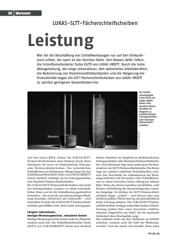 LUKAS-SLTT-F%u00e4cherschleifscheibenWer bei der Beschaffung von Schleifwerkzeugen nur auf den Einkaufspreis achtet, der spart an der falschen Stelle. Den Beweis daf%u00fcr liefern die Schleiflamellenteller Turbo (SLTT) von LUKAS-ERZETT. Durch die hohe Abtragsleistung, die lange Lebensdauer, den optimierten Arbeitskomfort, die Reduzierung von Maschinenstillstandzeiten und die Steigerung der Produktivit%u00e4t tragen die SLTT-F%u00e4cherschleifscheiben von LUKAS-ERZETT zu sp%u00fcrbar geringeren Gesamtkosten bei. Leistungh%u00f6here Standzeit im Vergleich zu herk%u00f6mmlichem Schruppscheiben oder Standard-F%u00e4cherschleifscheiben. Das Geheimnis liegt unter anderem in der Konstruktion der SLTT-F%u00e4cherschleifscheibe: Die flache Lage der optimal verklebten Sichellamellen reduziert den Verschlei%u00df. Im Au%u00dfenbereich des Werkzeugs befinden sich besonders viele Schleifk%u00f6rner, was zu einem besonders hohen Abtrag pro Minute f%u00fchrt. Wenn die oberen Lamellen verschlei%u00dfen, wird frischer Schleifbelag der darunterliegenden Lamellen freigelegt. So bleiben die SLTT-F%u00e4cherschleifscheiben l%u00e4nger %u201escharf%u201c %u2013 und k%u00f6nnen %u00fcber eine deutlich gr%u00f6%u00dfere Fl%u00e4che hinweg mit gleichbleibend hoher Leistung arbeiten. Die LUKAS-SLTT-F%u00e4cherschleifscheiben verf%u00fcgen neben ihrer hohen Schleifleistung zudem %u00fcber einen besonders stabilen, robusten Tr%u00e4gerteller aus Stahl, der f%u00fcr maximale Sicherheit ohne Bruchgefahr sorgt.Das reduziert nicht nur den Verbrauch an Schleifscheiben, sondern auch die Zahl der Werkzeugwechsel. Und das macht sich bezahlt. Denn jedes Auf den ersten Blick wirken die LUKAS-SLTTF%u00e4cherschleifscheiben beim Einkauf durch ihren St%u00fcckpreis oft teurer als herk%u00f6mmliche Schruppoder F%u00e4cherschleifscheiben. Die tats%u00e4chlichen Schleifkosten pro Kilogramm Abtrag liegen bei den Schleiflammellentellern Turbo von LUKAS-ERZETT jedoch deutlich niedriger als bei Schruppscheiben und Standard-F%u00e4cherschleifscheiben.Die LUKAS-SLTT-F%u00e4cherschleifscheiben sind nicht nur leistungsst%u00e4rker, sondern vor allem wirtschaftlicher. Denn wer bei die Schleifkosten ganzheitlich betrachtet %u2013 also auch die mit dem jeweiligen Werkzeug ben%u00f6tigte Arbeitszeit mit einbezieht %u2013 wird feststellen: Je mehr mit LUKAS-SLTT-F%u00e4cherschleifscheiben geschliffen wird, desto mehr wird gespart.L%u00e4ngere Lebensdauer, weniger Werkzeugwechsel, reduzierte KostenH%u00e4ufige Werkzeugwechsel kosten nicht nur Material, sondern auch Zeit. Die Schleiflamellenteller Turbo (SLTT) von LUKAS-ERZETT bieten eine deutlich Die Schleiflamellenteller Turbo (SLTT) von LUKAS-ERZETT bieten eine deutlich h%u00f6here Standzeit im Vergleich zu herk%u00f6mmlichem Schruppscheiben oder StandardF%u00e4cherschleifscheiben Fotos: LUKAS-ERZETT50 Werkstatt05|25