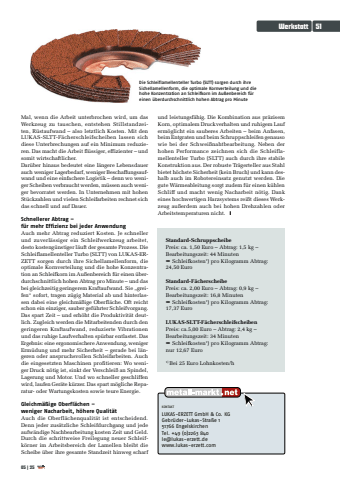 KONTAKTLUKAS-ERZETT GmbH & Co. KGGebr%u00fcder-Lukas-Stra%u00dfe 151766 EngelskirchenTel. +49 (0)2263 840le@lukas-erzett.dewww.lukas-erzett.comStandard-SchruppscheibePreis: ca. 1,50 Euro %u2013 Abtrag: 1,5 kg %u2013 Bearbeitungszeit: 44 Minuten%uf0b2 Schleifkosten1) pro Kilogramm Abtrag: 24,50 EuroStandard-F%u00e4cherscheibePreis: ca. 2,00 Euro %u2013 Abtrag: 0,9 kg %u2013 Bearbeitungszeit: 16,8 Minuten%uf0b2 Schleifkosten1) pro Kilogramm Abtrag: 17,37 EuroLUKAS-SLTT-F%u00e4cherschleifscheibenPreis: ca.5,00 Euro %u2013 Abtrag: 2,4 kg %u2013 Bearbeitungszeit: 34 Minuten%uf0b2 Schleifkosten1) pro Kilogramm Abtrag: nur 12,67 Euro1) Bei 25 Euro Lohnkosten/hDie Schleiflamellenteller Turbo (SLTT) sorgen durch ihre Sichellamellenform, die optimale Kornverteilung und die hohe Konzentration an Schleifkorn im Au%u00dfenbereich f%u00fcr einen %u00fcberdurchschnittlich hohen Abtrag pro MinuteMal, wenn die Arbeit unterbrochen wird, um das Werkzeug zu tauschen, entstehen Stillstandzeiten, R%u00fcstaufwand %u2013 also letztlich Kosten. Mit den LUKAS-SLTT-F%u00e4cherschleifscheiben lassen sich diese Unterbrechungen auf ein Minimum reduzieren. Das macht die Arbeit fl%u00fcssiger, effizienter %u2013 und somit wirtschaftlicher.Dar%u00fcber hinaus bedeutet eine l%u00e4ngere Lebensdauer auch weniger Lagerbedarf, weniger Beschaffungsaufwand und eine einfachere Logistik %u2013 denn wo weniger Scheiben verbraucht werden, m%u00fcssen auch weniger bevorratet werden. In Unternehmen mit hohen St%u00fcckzahlen und vielen Schleifarbeiten rechnet sich das schnell und auf Dauer. Schnellerer Abtrag %u2013 f%u00fcr mehr Effizienz bei jeder AnwendungAuch mehr Abtrag reduziert Kosten. Je schneller und zuverl%u00e4ssiger ein Schleifwerkzeug arbeitet, desto kosteng%u00fcnstiger l%u00e4uft der gesamte Prozess. Die Schleiflamellenteller Turbo (SLTT) von LUKAS-ERZETT sorgen durch ihre Sichellamellenform, die optimale Kornverteilung und die hohe Konzentration an Schleifkorn im Au%u00dfenbereich f%u00fcr einen %u00fcberdurchschnittlich hohen Abtrag pro Minute %u2013 und das bei gleichzeitig geringerem Kraftaufwand. Sie %u201egreifen%u201c sofort, tragen z%u00fcgig Material ab und hinterlassen dabei eine gleichm%u00e4%u00dfige Oberfl%u00e4che. Oft reicht schon ein einziger, sauber gef%u00fchrter Schleifvorgang. Das spart Zeit %u2013 und erh%u00f6ht die Produktivit%u00e4t deutlich. Zugleich werden die Mitarbeitenden durch den geringeren Kraftaufwand, reduzierte Vibrationen und das ruhige Laufverhalten sp%u00fcrbar entlastet. Das Ergebnis: eine ergonomischere Anwendung, weniger Erm%u00fcdung und mehr Sicherheit %u2013 gerade bei l%u00e4ngeren oder anspruchsvollen Schleifarbeiten. Auch die eingesetzten Maschinen profitieren: Wo weniger Druck n%u00f6tig ist, sinkt der Verschlei%u00df an Spindel, Lagerung und Motor. Und wo schneller geschliffen wird, laufen Ger%u00e4te k%u00fcrzer. Das spart m%u00f6gliche Reparatur- oder Wartungskosten sowie teure Energie. Gleichm%u00e4%u00dfige Oberfl%u00e4chen %u2013 weniger Nacharbeit, h%u00f6here Qualit%u00e4tAuch die Oberfl%u00e4chenqualit%u00e4t ist entscheidend. Denn jeder zus%u00e4tzliche Schleifdurchgang und jede aufw%u00e4ndige Nachbearbeitung kosten Zeit und Geld. Durch die schrittweise Freilegung neuer Schleifk%u00f6rner im Arbeitsbereich der Lamellen bleibt die Scheibe %u00fcber ihre gesamte Standzeit hinweg scharf und leistungsf%u00e4hig. Die Kombination aus pr%u00e4zisem Korn, optimalem Druckverhalten und ruhigem Lauf erm%u00f6glicht ein sauberes Arbeiten %u2013 beim Anfasen, beim Entgraten und beim Schruppschleifen genauso wie bei der Schwei%u00dfnahtbearbeitung. Neben der hohen Performance zeichnen sich die Schleiflamellenteller Turbo (SLTT) auch durch ihre stabile Konstruktion aus. Der robuste Tr%u00e4gerteller aus Stahl bietet h%u00f6chste Sicherheit (kein Bruch) und kann deshalb auch im Robotereinsatz genutzt werden. Die gute W%u00e4rmeableitung sorgt zudem f%u00fcr einen k%u00fchlen Schliff und macht wenig Nacharbeit n%u00f6tig. Dank eines hochwertigen Harzsystems rei%u00dft dieses Werkzeug au%u00dferdem auch bei hohen Drehzahlen oder Arbeitstemperaturen nicht. yWerkstatt 5105 | 25