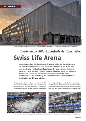 Sport- und Multifunktionshalle der SuperlativeSwiss Life Arena Das markante Bauwerk der Swiss Life Arena in Z%u00fcrich Altstetten charakterisiert eine textil anmutende Fassade aus OrtbetonIm nordwestlichen Z%u00fcricher Quartier Altstetten bildet die Swiss Life Arena seit ihrer Er%u00f6ffnung nicht nur ein theatrales Entr%u00e9e zur Stadt. Es ist auch eine Sport- und Eventhalle der Superlative. Die lang ersehnte Heimspielst%u00e4tte des Eishockeyclubs ZSC Lions eroberte innerhalb seiner noch jungen Bestandszeit bereits die Herzen der Besucherinnen und Besucher, Veranstalter und einer Fachjury, die sie vor Kurzem zu einem der besten Sportstadien der Schweiz w%u00e4hlten.Die Sympathie d%u00fcrfte durchaus auch mit der Architektur zusammenh%u00e4ngen, die dem renommierten B%u00fcro Caruso St. John Architects aus London und Z%u00fcrich zuzuschreiben ist. Von au%u00dfen ist der zu zwei Seiten abgestufte Quader in hellen Beton geh%u00fcllt, dessen detailreiche Struktur einer Wellenform und dem Faltenwurf eines Theatervorhangs gleicht. Von innen zeigt sich eine modern ausgestattete Arena mit techAuf dem 28.000 Quadratmeter gro%u00dfen Grundst%u00fcck befindet sich unter anderem eine Arena mit Platz f%u00fcr bis zu 12.000 ZuschauerFotos: R&D D%u00fcrr52 Baustelle05|25