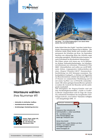 KONTAKTInterpane Glas Industrie AGSohnreystra%u00dfe 21, 37697 Lauenf%u00f6rdeTel. +49 (0)5273 8090info.interpane@agc.comwww.agc-interpane.comHenze Glas GmbHG%u00e4nsewinkel 2, 37412 H%u00f6rden am HarzTelefon: +49 (0)5521 99090henze@henzeglas.dewww.henzeglas.dekalter Nebel %u00fcber den Gipfel%u201c, berichtet Andr%u00e9 Kaczmarek, Glasermeister bei Henze Glas in H%u00f6rden. %u201eDer teilweise starke Wind drehte und wendete zudem permanent die Scheiben am Kran. Im September machten uns orkanartige B%u00f6en das Arbeiten sogar zeitweilig unm%u00f6glich. Gl%u00fccklicherweise konnten wir nach Feierabend im Brockenhotel %u00fcbernachten.%u201c Die Gl%u00e4ser setzen sich innen aus 16,76 Millimeter dickem Verbundsicherheitsglas, im Scheibenzwischenraum aus schwarzen %u201eChromatech Ultra 9004%u201c-Abstandhaltern und au%u00dfen aus zw%u00f6lf Millimeter dicken, vorgespannten Au%u00dfenscheiben mit einer %u201eStopray Ultraselect 60/27%u201c-Sonnenschutzbeschichtung von AGC Interpane zusammen. Das hochselektive Coating (S = 2,19) l%u00e4sst viel Tageslicht ins Besucherzentrum, sch%u00fctzt mit einem g-Wert von 27 Prozent vor sommerlicher %u00dcberhitzung und ist mit einem Ug-Wert von 1,0 W/(m2K) w%u00e4rmed%u00e4mmend. Mit seiner geringen Innenreflexion optimiert es zudem die Aussicht der Besucher auf die umliegende Landschaft. Alle Basisgl%u00e4ser der Stopray-Familie sind mit dem Nachhaltigkeitszertifikat %u201eCradle to Cradle%u201c in Bronze ausgezeichnet und im Zuge der neuen CO2-reduzierten Produktion der europ%u00e4ischen AGCGruppe auch als %u201eLow Carbon%u201c-Varianten verf%u00fcgbar %u2013 mit dazugeh%u00f6riger EPD. yFast fertig %u2013 nur einige Verglasungen in der oberen Reihe warten noch auf den Austausch primiere.deMonteure w%u00e4hlenihre Nummer #1!%u2022 Schneller & einfacher Aufbau%u2022 Konfektionierte Baus%u00e4tze%u2022 Erstklassiger Marketing-ServiceUnser Team zeigt dir, warum wir der Nr. #1 Partner f%u00fcr Monteure sind.Terrassend%u00e4cher %u2013 Sommerg%u00e4rten %u2013 Winterg%u00e4rten05|25