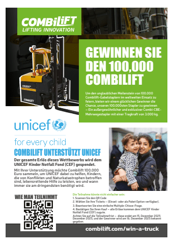 25GEWINNEN SIE DEN 100,000 COMBILIFTUm den unglaublichen Meilenstein von 100.000 Combilift-Gabelstaplern im weltweiten Einsatz zu feiern, bieten wir einem gl%u00fccklichen Gewinner die Chance, unseren 100.000sten Stapler zu gewinnen %u2013 Ein au%u00dfergew%u00f6hnlicher und exklusiver Combi-CBEMehrwegestapler mit einer Tragkraft von 3.000 kg.combilift.com/win-a-truckDer gesamte Erl%u00f6s dieses Wettbewerbs wird dem UNICEF Kinder Notfall Fond (CEF) gespendet.COMBILIFT UNTERST%u00dcTZT UNICEFMit Ihrer Unterst%u00fctzung m%u00f6chte Combilift 100.000 Euro sammeln, um UNICEF dabei zu helfen, Kindern, die von Konflikten und Naturkatastrophen betroffen sind, lebensrettende Hilfe zu leisten, wo und wann immer sie am dringendsten ben%u00f6tigt wird.Die Teilnahme k%u00f6nnte nicht einfacher sein:1. Scannen Sie den QR Code2. W%u00e4hlen Sie Ihre Tickets %u2013 (Einzel- oder als Paket Option verf%u00fcgbar).3. Beantworten Sie eine einfache Multiple-Chioce-Frage.4. Best%u00e4tigen Sie Ihren Kauf %u2013 alle Erl%u00f6se kommen dem UNICEF Kinder Notfall Fond (CEF) zugute.Achten Sie auf die Teilnahmefrist %u2013 diese endet am 15. Dezember 2025 December 2025, und der Gewinner wird am 16. Dezember 2025 bekannt gegeben.WIE MAN TEILNIMMT