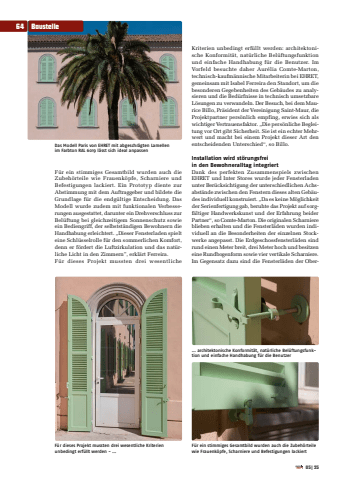 Kriterien unbedingt erf%u00fcllt werden: architektonische Konformit%u00e4t, nat%u00fcrliche Bel%u00fcftungsfunktion und einfache Handhabung f%u00fcr die Benutzer. Im Vorfeld besuchte daher Aur%u00e9lia Comte-Marton, technisch-kaufm%u00e4nnische Mitarbeiterin bei EHRET, gemeinsam mit Isabel Ferreira den Standort, um die besonderen Gegebenheiten des Geb%u00e4udes zu analysieren und die Bed%u00fcrfnisse in technisch umsetzbare L%u00f6sungen zu verwandeln. Der Besuch, bei dem Maurice Billo, Pr%u00e4sident der Vereinigung Saint-Maur, die Projektpartner pers%u00f6nlich empfing, erwies sich als wichtiger Vertrauensfaktor. %u201eDie pers%u00f6nliche Begleitung vor Ort gibt Sicherheit. Sie ist ein echter Mehrwert und macht bei einem Projekt dieser Art den entscheidenden Unterschied%u201c, so Billo.Installation wird st%u00f6rungsfrei in den Bewohneralltag integriertDank des perfekten Zusammenspiels zwischen EHRET und Inter Stores wurde jeder Fensterladen unter Ber%u00fccksichtigung der unterschiedlichen Achsabst%u00e4nde zwischen den Fenstern dieses alten Geb%u00e4udes individuell konstruiert. %u201eDa es keine M%u00f6glichkeit der Serienfertigung gab, beruhte das Projekt auf sorgf%u00e4ltiger Handwerkskunst und der Erfahrung beider Partner%u201c, so Comte-Marton. Die originalen Scharniere blieben erhalten und die Fensterl%u00e4den wurden individuell an die Besonderheiten der einzelnen Stockwerke angepasst. Die Erdgeschossfensterl%u00e4den sind rund einen Meter breit, drei Meter hoch und besitzen eine Rundbogenform sowie vier vertikale Scharniere. Im Gegensatz dazu sind die Fensterl%u00e4den der OberF%u00fcr ein stimmiges Gesamtbild wurden auch die Zubeh%u00f6rteile wie Frauenk%u00f6pfe, Scharniere und Befestigungen lackiert. Ein Prototyp diente zur Abstimmung mit dem Auftraggeber und bildete die Grundlage f%u00fcr die endg%u00fcltige Entscheidung. Das Modell wurde zudem mit funktionalen Verbesserungen ausgestattet, darunter ein Drehverschluss zur Bel%u00fcftung bei gleichzeitigem Sonnenschutz sowie ein Bediengriff, der selbstst%u00e4ndigen Bewohnern die Handhabung erleichtert. %u201eDieser Fensterladen spielt eine Schl%u00fcsselrolle f%u00fcr den sommerlichen Komfort, denn er f%u00f6rdert die Luftzirkulation und das nat%u00fcrliche Licht in den Zimmern%u201d, erkl%u00e4rt Ferreira.F%u00fcr dieses Projekt mussten drei wesentliche Das Modell Paris von EHRET mit abgeschr%u00e4gten Lamellen im Farbton RAL 6019 l%u00e4sst sich ideal anpassenF%u00fcr dieses Projekt mussten drei wesentliche Kriterien unbedingt erf%u00fcllt werden - %u2026%u2026 architektonische Konformit%u00e4t, nat%u00fcrliche Bel%u00fcftungsfunktion und einfache Handhabung f%u00fcr die BenutzerF%u00fcr ein stimmiges Gesamtbild wurden auch die Zubeh%u00f6rteile wie Frauenk%u00f6pfe, Scharniere und Befestigungen lackiert 64 Baustelle05|25