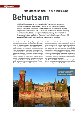 Alte Eichenrahmen %u2013 neue VerglasungBehutsam%u201eSchloss Wynendaele ist ein magischer Ort%u201c, schw%u00e4rmt Schlossherr J%u00e9r%u00f4me Matthieu de Wynendaele. %u201eFINEO ist ein magisches Produkt%u201c, erg%u00e4nzt Christophe Vanassche, Objektberater bei RenoWindow, einem belgischen Unternehmen, das sich auf die nachhaltige Fenstersanierung spezialisiert hat. F%u00fcr die energetische Restaurierung der historischen Verglasung in dem idyllischen Wasserschloss in Westflandern fanden sich also zwei Partner, die nicht perfekter harmonieren konnten.Urspr%u00fcnglich als h%u00f6lzerne Burganlage im sp%u00e4ten elften Jahrhundert errichtet, wurde Schloss Wynendaele im 13. Jahrhundert durch eine ummauerte Rundburg ersetzt. Im zw%u00f6lften und 13. Jahrhundert war das Schloss Sitz der Grafen von Flandern und auch sp%u00e4ter immer wieder Schauplatz bedeutender historischer Ereignisse %u2013 darunter der fatale Reitunfall der jungen Maria von Burgund in den umliegenden W%u00e4ldern. In den 1870er Jahren wurde es von der Familie Matthieu, in deren Besitz sich das Anwesen seit 1833 ununterbrochen befindet, umfassend neugotisch %u00fcberformt und erhielt sein heutiges Aussehen mit den mittelalterlich anmutenden T%u00fcrmen, Zinnen, Treppengiebeln und Rundbogentoren. Nachdem er 2021 seinen Lebensmittelpunkt nach Westflandern verlegt hatte, stand J%u00e9r%u00f4me Matthieu de Wynendaele vor gro%u00dfen Herausforderungen. Dominierend war nat%u00fcrlich das Thema Energiesparen. Wie konnte man den Geist eines mehr als 2000 Quadratmeter gro%u00dfen, denkmalgesch%u00fctzten Schlosses mit einer rund 1000 Jahre zur%u00fcckreichenden Geschichte bewahren und gleichzeitig den Energieverbrauch senken? Der Schlossherr ist %u00fcberzeugt: Die einzige L%u00f6sung lag in der hoch w%u00e4rmed%u00e4mmenden FINEO-Vakuumverglasung. %u201eDie fl%u00e4mische Beh%u00f6rde f%u00fcr Kulturerbe hat uns gebeten, die vorhandenen Fensterrahmen zu erhalten, wo immer es m%u00f6glich war. Deshalb brauchten wir ein Schloss Wynendaele existiert seit dem 13. Jahrhundert als ummauerte Rundburg Fotos: FINEO by AGC66 Baustelle05|25
