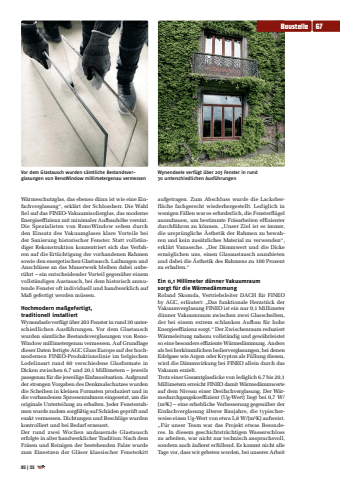 W%u00e4rmeschutzglas, das ebenso d%u00fcnn ist wie eine Einfachverglasung%u201c, erkl%u00e4rt der Schlossherr. Die Wahl fiel auf das FINEO-Vakuumisolierglas, das moderne Energieeffizienz mit minimaler Aufbauh%u00f6he vereint.Die Spezialisten von RenoWindow sehen durch den Einsatz des Vakuumglases klare Vorteile bei der Sanierung historischer Fenster. Statt vollst%u00e4ndiger Rekonstruktion konzentriert sich das Verfahren auf die Ert%u00fcchtigung der vorhandenen Rahmen sowie den energetischen Glastausch. Laibungen und Anschl%u00fcsse an das Mauerwerk bleiben dabei unber%u00fchrt %u2013 ein entscheidender Vorteil gegen%u00fcber einem vollst%u00e4ndigen Austausch, bei dem historisch anmutende Fenster oft individuell und handwerklich auf Ma%u00df gefertigt werden m%u00fcssen. Hochmodern ma%u00dfgefertigt,traditionell installiertWynendaele verf%u00fcgt %u00fcber 203 Fenster in rund 30 unterschiedlichen Ausf%u00fchrungen. Vor dem Glastausch wurden s%u00e4mtliche Bestandsverglasungen von RenoWindow millimetergenau vermessen. Auf Grundlage dieser Daten fertigte AGC Glass Europe auf der hochmodernen FINEO-Produktionslinie im belgischen Lodelinsart rund 60 verschiedene Glasformate in Dicken zwischen 6,7 und 20,1 Millimetern %u2013 jeweils passgenau f%u00fcr die jeweilige Einbausituation. Aufgrund der strengen Vorgaben des Denkmalschutzes wurden die Scheiben in kleinen Formaten produziert und in die vorhandenen Sprossenrahmen eingesetzt, um die originale Unterteilung zu erhalten. Jeder Fensterrahmen wurde zudem sorgf%u00e4ltig auf Sch%u00e4den gepr%u00fcft und exakt vermessen. Dichtungen und Beschl%u00e4ge wurden kontrolliert und bei Bedarf erneuert.Der rund zwei Wochen andauernde Glastausch erfolgte in alter handwerklicher Tradition: Nach dem Fr%u00e4sen und Reinigen der bestehenden Falze wurde zum Einsetzen der Gl%u00e4ser klassischer Fensterkitt aufgetragen. Zum Abschluss wurde die Lackoberfl%u00e4che fachgerecht wiederhergestellt. Lediglich in wenigen F%u00e4llen war es erforderlich, die Fensterfl%u00fcgel auszubauen, um bestimmte Fr%u00e4sarbeiten effizienter durchf%u00fchren zu k%u00f6nnen. %u201eUnser Ziel ist es immer, die urspr%u00fcngliche %u00c4sthetik der Rahmen zu bewahren und kein zus%u00e4tzliches Material zu verwenden%u201c, erkl%u00e4rt Vanassche. %u201eDer D%u00e4mmwert und die Dicke erm%u00f6glichen uns, einen Glasaustausch anzubieten und dabei die %u00c4sthetik des Rahmens zu 100 Prozent zu erhalten.%u201c Ein 0,1 Millimeter d%u00fcnner Vakuumraum sorgt f%u00fcr die W%u00e4rmed%u00e4mmungRoland Skomda, Vertriebsleiter DACH f%u00fcr FINEO by AGC, erl%u00e4utert: %u201eDas funktionale Herzst%u00fcck der Vakuumverglasung FINEO ist ein nur 0,1 Millimeter d%u00fcnner Vakuumraum zwischen zwei Glasscheiben, der bei einem extrem schlanken Aufbau f%u00fcr hohe Energieeffizienz sorgt.%u201c Der Zwischenraum reduziert W%u00e4rmeleitung nahezu vollst%u00e4ndig und gew%u00e4hrleistet so eine besonders effiziente W%u00e4rmed%u00e4mmung. Anders als bei herk%u00f6mmlichen Isolierverglasungen, bei denen Edelgase wie Argon oder Krypton als F%u00fcllung dienen, wird die D%u00e4mmwirkung bei FINEO allein durch das Vakuum erzielt.Trotz einer Gesamtglasdicke von lediglich 6,7 bis 20,1 Millimetern erreicht FINEO damit W%u00e4rmed%u00e4mmwerte auf dem Niveau einer Dreifachverglasung. Der W%u00e4rmedurchgangskoeffizient (Ug-Wert) liegt bei 0,7 W/(m%u00b2K) %u2013 eine erhebliche Verbesserung gegen%u00fcber der Einfachverglasung %u00e4lterer Baujahre, die typischerweise einen Ug-Wert von etwa 5,8 W/(m%u00b2K) aufweist.%u201eF%u00fcr unser Team war das Projekt etwas Besonderes. In diesem geschichtstr%u00e4chtigen Wasserschloss zu arbeiten, war nicht nur technisch anspruchsvoll, sondern auch %u00e4u%u00dferst erf%u00fcllend. Es kommt nicht alle Tage vor, dass wir gebeten werden, bei unserer Arbeit Vor dem Glastausch wurden s%u00e4mtliche Bestandsverglasungen von RenoWindow millimetergenau vermessenWynendaele verf%u00fcgt %u00fcber 203 Fenster in rund30 unterschiedlichen Ausf%u00fchrungenBaustelle 6705 | 25