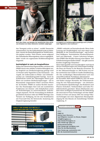 KONTAKTFINEO SrlAvenue Jean Monnet 41348 Ottignies-Louvain-la-Neuve, Belgieninfo@fineoglass.euhttp://www.fineoglass.euhttp://www.agc-glass.eu (Unternehmensseite), http://www.agc-yourglass.com (Glas f%u00fcr die Bauindustrie) http://www.agc-automotive.com (f%u00fcr die Automobilindustrie)den Turmgeist nicht zu st%u00f6ren%u201c, erz%u00e4hlt Vannasche schmunzelnd. Um den Schlossbetrieb nicht zu behindern, musste die Baustellenlogistik im Vorfeld minuti%u00f6s geplant werden. Viele Fenster waren aufgrund des umlaufenden Wassergrabens schwer zug%u00e4nglich, daher wurde ein sogenanntes Eichh%u00f6rnchenger%u00fcst eingesetzt.Nachhaltigkeit ist mehr als EnergieeffizienzNeben den thermischen Eigenschaften zeichnet sich FINEO durch eine erh%u00f6hte Lichtdurchl%u00e4ssigkeit aus: Im Vergleich zur Dreifachverglasung gelangt rund 15 Prozent mehr Tageslicht in den Innenraum %u2013 ein Aspekt, der insbesondere in Wohn- und Arbeitsbereichen zur Aufenthaltsqualit%u00e4t beitr%u00e4gt. Auch im Schallschutz erzielt das Vakuumglas ebenso gute Werte wie moderne Dreifachverglasungen %u2013 die in Wynendaele eingesetzten Gl%u00e4ser erreichen Werte bis 36 Dezibel. FINEO ist zudem flexibel einsetzbar: Das Standardglas l%u00e4sst sich mit zus%u00e4tzlichen Funktionen wie Sonnen- oder Schallschutz sowie als Sicherheitsglas an unterschiedliche Anforderungen anpassen. F%u00fcr die Anwendung im denkmalgesch%u00fctzten Kontext steht mit FINEO Heritage eine Variante zur Verf%u00fcgung, bei der eine Kombination mit Fourcault-Glas die historische Anmutung der Originalverglasung bewahrt.FOPPE Sonnenschutz-Befestigungsbolzen%u2022 f%u00fcr alle Glas-Fassadensysteme%u2022 auch f%u00fcr nachtr%u00e4gliche MontageKNALLT DIE SONNE AUF METALL?UNSER BOLZEN H%u00c4LT IN JEDEM FALL!+49 5904 9393-93 zubehoer@foppe.de foppe-shop.deDein Abschnittstext%u201eFINEO verbindet auf beeindruckende Weise hohe Leistung mit Nachhaltigkeit und setzt damit neue Ma%u00dfst%u00e4be in der Fenstertechnologie%u201c, sagt JochenPaul Hoffmann, Vertriebsleiter Nordwestdeutschland und D%u00e4nemark. %u201eUnsere Labortests belegen, dass FINEO %u00fcber 60 Jahre hinweg seine D%u00e4mm- und Schallschutzeigenschaften beh%u00e4lt %u2013 das gibt unseren Kunden langfristige Sicherheit.%u201c Diese hohe Qualit%u00e4t und Zuverl%u00e4ssigkeit wird durch diverse Zertifizierungen und Zulassungen best%u00e4tigt, die Fineo als Pionier in der Branche ausweisen. So ist das Vakuumisolierglas zu 100 Prozent recycelbar und besitzt eine Cradle-to-Cradle-Zertifizierung, die den nachhaltigen Materialkreislauf und eine umweltfreundliche Produktion dokumentiert.Im November 2024 erhielt FINEO by AGC als erster und bisher einziger Hersteller die CE-Kennzeichnung f%u00fcr sein Vakuumisolierglas %u2013 ein international anerkanntes Qualit%u00e4tssiegel, das Bauherren und Planern Sicherheit, Verl%u00e4sslichkeit und hohe Produktstandards garantiert. Dieser Meilenstein markiert einen wichtigen Fortschritt f%u00fcr die Verbreitung der innovativen Fineo-Technologie auf dem Markt. Zudem ist Fineo seit Januar 2025 das einzige Vakuum-Isolierglas mit einer allgemeinen Bauartgenehmigung f%u00fcr den Einsatz als linienf%u00f6rmige Vertikalverglasung. yNach dem Fr%u00e4sen und Reinigen der bestehenden Falze wurde zum Einsetzen der Gl%u00e4ser klassischer Lein%u00f6lkitt aufgetragenIm Vergleich zur Dreifachverglasung gelangt rund 15 Prozent mehr Tageslicht in den Innenraum68 Baustelle05|25