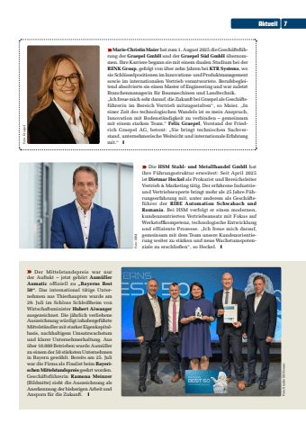 Marie-Christin Maier hat zum 1. August 2025 die Gesch%u00e4ftsf%u00fchrung der Graepel GmbH und der Graepel S%u00fcd GmbH %u00fcbernommen. Ihre Karriere begann sie mit einem dualen Studium bei der RENK Group, gefolgt von %u00fcber zehn Jahren bei KTR Systems, wo sie Schl%u00fcsselpositionen im Innovations- und Produktmanagement sowie im internationalen Vertrieb verantwortete. Berufsbegleitend absolvierte sie einen Master of Engineering und war zuletzt Branchenmanagerin f%u00fcr Baumaschinen und Landtechnik.%u201eIch freue mich sehr darauf, die Zukunft bei Graepel als Gesch%u00e4ftsf%u00fchrerin im Bereich Vertrieb mitzugestalten%u201c, so Maier. %u201eIn einer Zeit des technologischen Wandels ist es mein Anspruch, Innovation mit Bodenst%u00e4ndigkeit zu verbinden %u2013 gemeinsam mit einem starken Team.%u201c Felix Graepel, Vorstand der Friedrich Graepel AG, betont: %u201eSie bringt technischen Sachverstand, unternehmerische Weitsicht und internationale Erfahrung Foto: Graepelmit.%u201c yFoto: HSM Die HSM Stahl- und Metallhandel GmbH hat ihre F%u00fchrungsstruktur erweitert: Seit April 2025 ist Dietmar Heckel als Prokurist und Bereichsleiter Vertrieb & Marketing t%u00e4tig. Der erfahrene Industrieund Vertriebsexperte bringt mehr als 25 Jahre F%u00fchrungserfahrung mit, unter anderem als Gesch%u00e4ftsf%u00fchrer der RIBE Automation Schwabach und Romania. Bei HSM verfolgt er einen modernen, kundenzentrierten Vertriebsansatz mit Fokus auf Werkstoffkompetenz, technologische Entwicklung und effiziente Prozesse. %u201eIch freue mich darauf, gemeinsam mit dem Team unsere Kundenorientierung weiter zu st%u00e4rken und neue Wachstumspotenziale zu erschlie%u00dfen%u201c, so Heckel. y Der Mittelstandspreis war nur der Auftakt %u2013 jetzt geh%u00f6rt Aum%u00fcller Aumatic offiziell zu %u201eBayerns Best 50%u201c. Das international t%u00e4tige Unternehmen aus Thierhaupten wurde am 29. Juli im Schloss Schlei%u00dfheim von Wirtschaftsminister Hubert Aiwangerausgezeichnet. Die j%u00e4hrlich verliehene Auszeichnung w%u00fcrdigt inhabergef%u00fchrte Mittelst%u00e4ndler mit starker Eigenkapitalbasis, nachhaltigem Umsatzwachstum und klarer Unternehmerhaltung. Aus %u00fcber 10.000 Betrieben wurde Aum%u00fcller zu einem der 50 st%u00e4rksten Unternehmen in Bayern gew%u00e4hlt. Bereits am 25. Juli war die Firma als Finalist beim Bayerischen Mittelstandspreis geehrt worden. Gesch%u00e4ftsf%u00fchrerin Ramona Meinzer (Bildmitte) sieht die Auszeichnung als Anerkennung der bisherigen Arbeit und Ansporn f%u00fcr die Zukunft. y Foto: Studio SX HeuserAktuell 7