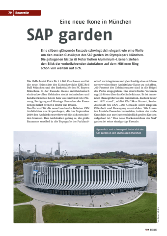 Eine neue Ikone in M%u00fcnchenSAP gardenEine silbern gl%u00e4nzende Fassade schwingt sich elegant wie eine Welle um den ovalen Glask%u00f6rper des SAP garden im Olympiapark M%u00fcnchen. Die gebogenen bis zu 18 Meter hohen Aluminium-Lisenen ziehen den Blick der vorbeifahrenden Autofahrer auf dem Mittleren Ring schon von weitem auf sich.Die Halle bietet Platz f%u00fcr 11.500 Zuschauer und ist die neue Heimst%u00e4tte des Eishockeyclubs EHC Red Bull M%u00fcnchen und der Basketballer des FC Bayern M%u00fcnchen. In der Fassade dieses architektonisch eindrucksvollen Geb%u00e4udes steckt technisches und handwerkliches Know-how aus S%u00fcdtirol: Die Planung, Fertigung und Montage %u00fcbernahm der Fassadenspezialist Frener & Reifer aus Brixen. Den Entwurf f%u00fcr die neue Landmarke lieferten 3XN Architekten aus Kopenhagen, die im September 2019 den Architektenwettbewerb f%u00fcr sich entscheiden konnten. Den Architekten gelang es, die gro%u00dfe Baumasse sensibel in die Topografie der Parklandschaft zu integrieren und gleichzeitig eine sichtbare unverwechselbare Architektur-Ikone zu schaffen. %u201e60 Prozent der Geb%u00e4udemasse sind in die H%u00fcgel des Parks eingegraben. Das oberirdische Volumen ragt 20 Meter %u00fcber das Gel%u00e4nde hinaus. Es ist immer noch etwas gr%u00f6%u00dfer als das Radstadion, das hier zuvor seit 1972 stand%u201c, erkl%u00e4rt Olaf Skov Kunert, Senior Associate bei 3XN. %u201eDas Geb%u00e4ude sollte ringsum Offenheit und Bewegung ausstrahlen. Wir konnten frontale Fassaden vermeiden, indem der ovale Grundriss aus zwei unterschiedlich gro%u00dfen Kreisen aufgebaut ist.%u201c Das neue Markenzeichen des SAP garden ist seine einzigartige Fassade. Foto: Frener & ReiferDynamisch und schwungvoll bettet sich der SAP garden in den Olympiapark M%u00fcnchen72 Baustelle05|25