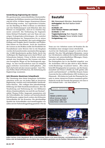 KONTAKTFRENER & REIFER GmbH Alfred-Ammon-Stra%u00dfe 31 39042 Brixen (BZ) ITALY www.frener-reifer.comSonderl%u00f6sung Engineering der Lisenen Die geschossweise unterschiedlichen Horizontalbewegungen des Rohbaus mussten auch beim Engineering der elf bis 18 Meter langen Aluminium-Lisenen ber%u00fccksichtigt werden. Aus logistischen Gr%u00fcnden, um das Handling im Werk in Brixen zu erleichtern und den Stra%u00dfentransport nach M%u00fcnchen %u00fcber den Brenner zu erm%u00f6glichen, sind sie in einzelne Segmente unterteilt. Die Verbindung der Segmente l%u00f6sten Michael Fischnaller und sein Team mit neuartigen Federgelenksverbindungen, die zun%u00e4chst Bauteilpr%u00fcfungen bei Temperaturen bis zu minus 40 Grad Celsius durchliefen. Erst nach erfolgreicher Pr%u00fcfung und Freigabe durch Gutachter und Pr%u00fcfstatiker kamen sie zum Einsatz. Auch der Anschluss der Lisenen an den Rohbau stellte die Flexibilit%u00e4t der Fassadenbauer unter Beweis: Erst in der Bauphase wurden die kumulierenden maximalen Bewegungen des 13.000 Quadratmeter gro%u00dfen Dachs durch das Aufbringen der Begr%u00fcnung sowie durch Wind- und Schneelasten bekannt. Frener & Reifer entwickelte zeitnah eine Sonderl%u00f6sung: Die Lisenen sind %u00fcber eine bewegliche Wippe an das Dachtragwerk angeh%u00e4ngt. An den Geschossdecken sind sie lediglich gegen seitliches Ausweichen straff gehalten. %u201eDas Dach darf nicht mit den Lisenen spielen%u201c, fasst Thomas Priller, Head of Production, die Zielsetzung des Engineerings zusammen. Acht Kilometer Aluminium-Schwei%u00dfnaht Die Umsetzung einer derart komplexen Architektur erforderte nicht nur ein hohes Ma%u00df an kreativem Engineering, sondern auch meisterhaftes handwerkliches K%u00f6nnen. %u201eWir verf%u00fcgen %u00fcber jahrzehntelange Erfahrung mit Stahl-Sonderkonstruktionen, aber die Verarbeitung und Verformung der vier Millimeter dicken Aluminiumbleche war auch f%u00fcr uns Neuland%u201c, erkl%u00e4rt Thomas Priller. Insgesamt summierten sich die Schwei%u00dfn%u00e4hte der Lisenen auf beeindruckende f%u00fcnf Kilometer, erg%u00e4nzt durch weitere drei Kilometer Schwei%u00dfn%u00e4hte f%u00fcr die Konsolen. Die gleichm%u00e4%u00dfige Qualit%u00e4t der Schwei%u00dfn%u00e4hte wird zerst%u00f6rungsfrei von au%u00dfen mit der Farbeindringpr%u00fcfung garantiert. F%u00fcr ein Team aus vier Arbeitern waren 20 Stunden f%u00fcr die Produktion einer einzigen Lisene erforderlich. Auch bei der Glasfassade mangelt es nicht an Komplexit%u00e4t: Von den 700 gefertigten Elementen, waren nur 156 identisch, w%u00e4hrend der Gro%u00dfteil individuelle Varianten mit unterschiedlichen %u00d6ffnungen, Glastypen oder Lochblechen darstellte. Das Endergebnis hat in der Realit%u00e4t eingel%u00f6st, was die Architekten 3XN im Jahr 2019 in ihren Wettbewerbs-Renderings visualisiert hatten: %u201eWie schon beim IOC-Hauptquartier in Lausanne, war die Zusammenarbeit mit Frener & Reifer am SAP garden sehr positiv und bereichernd%u201c, so Olaf Skov Kunert, Senior Associate bei den weltber%u00fchmten 3XN Architects aus D%u00e4nemark. %u201eWir haben im Laufe der Planung die Fassade in einem intensiven Prozess zusammen gel%u00f6st. Dadurch wurde die Fassade fast genauso wie man es sich ertr%u00e4umt hatte %u2013 nur eben besser!%u201c yAu%u00dfen Coolness, innen Hexenkessel: Bis zu 11.500 Zuschauer finden in der neuen Eishockey- und Basketballarena Platz. F%u00fcr den Umbau wird das Basketballfeld wie eine B%u00fchne %u00fcber die Eisfl%u00e4che geschoben und die flexiblen Trib%u00fcnen werden angepasstFotos: 3XN ArchitectsBautafelOrt: Olympiapark M%u00fcnchen, Deutschland Auftraggeber: Red Bull Stadion GmbHM%u00fcnchen Architekt: 3XN Joint-Venture-Partner und lokaler Architekt: CL MAPTragwerksplanung: Buro Happold, Unger Stahlbau-Fassade: Frener & Reifer GmbHFertigstellung: 2024Baustelle 7505 | 25