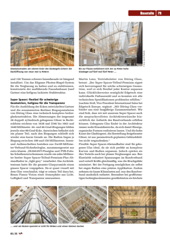 und 150 Tonnen schwere Innenfassade ist h%u00e4ngend installiert. Um das filigrane Pfosten-Riegel-System f%u00fcr die Verglasung zu halten und zu stabilisieren, konstruierte der ausf%u00fchrende Fassadenbauer Josef Gartner eine hellgrau lackierte Stahlstruktur. Super Spacer: flexibel f%u00fcr schwierige Geometrien, hellgrau f%u00fcr die TransparenzF%u00fcr die Ausbildung der Ecken entwickelten Gartner und die renommierten Berliner Biegespezialisten von D%u00f6ring Glass eine technisch komplexe Isolierglaskonstruktion. Die Abmessungen der insgesamt 28 doppelt zylindrisch gebogenen Gl%u00e4ser in Rechteckform reichten von 1638 mal 5546 bis 1663 mal 3440 Millimeter. 44- und 46-Grad-Biegungen bilden jeweils eine 90-Grad-Ecke, dazwischen befindet sich ein planer Teil, nach den Biegungen schlie%u00dft sich wieder eine kurze Gerade an. Die Radien liegen je Biegung zwischen 100 und 150 Millimetern. Innenund Au%u00dfenscheiben bestehen aus Zw%u00f6lf-Millimeter-Verbund-Sicherheitsglas, zusammengesetzt aus extra klarem %u201eDIAMANT-Floatglas und PVB-Folie. Im Scheibenzwischenraum wurde ein zehn Millimeter breiter Super Spacer-TriSeal-Premium-Plus-Abstandhalter in %u201elight grey%u201c verarbeitet. Das Architektenteam hatte f%u00fcr die gesamte Glaspyramide einen grauen Spacer vorgegeben. Da er quasi visuell mit dem Glas verschmilzt, tr%u00e4gt er seinen Teil dazu bei, Renzo Pianos Vision einer Atmosph%u00e4re aus Licht, Luftigkeit und Transparenz umzusetzen.Martin Lenz, Vertriebsleiter von D%u00f6ring Glass, betont: %u201eDer Super Spacer-TriSeal-Premium eignet sich hervorragend f%u00fcr solche schwierigen Geometrien, weil er sich flexibel jeder Kontur anpassen kann. Gl%u00fccklicherweise erm%u00f6glicht Edgetech eine individuelle Farbauswahl und so konnten wir alle technischen Spezifikationen problemlos erf%u00fcllen.%u201cJoachim Sto%u00df, Vice President International Sales bei Edgetech Europe, erg%u00e4nzt: %u201eMit D%u00f6ring Glass verbindet uns eine langj%u00e4hrige Zusammenarbeit. Wir sind froh, dass wir mit unserem Super Spacer auch die anspruchsvollsten Architektenw%u00fcnsche hinsichtlich der %u00c4sthetik des Randverbunds erf%u00fcllen k%u00f6nnen. Gebogenes Glas findet in der Architektur immer mehr Einsatzbereiche, da sich damit fl%u00fcssige, organische Formen realisieren lassen. Und die hohe Kunst der Glasbiegerei, die Herstellung freigeformter Gl%u00e4ser, ist aus parametrisch geplanten Geb%u00e4udeh%u00fcllen nicht wegzudenken.%u201c Flexible Super Spacer-Abstandhalter sind f%u00fcr gebogenes Glas ideal, da sie sich perfekt an komplexe Kurven und Radien anpassen. Jedoch spielen sie ihre Vorteile auch bei planen Verglasungen aus. Ihre Elastizit%u00e4t reduziert Spannungen im Randverbund und verteilt Kr%u00e4fte gleichm%u00e4%u00dfig, was die Bruchgefahr minimiert. Bei der Fertigung erm%u00f6glichen sie selbst bei engen Radien eine pr%u00e4zise Applikation. Zudem nehmen sie kaum Klimalasten auf, was den Randverbund zus%u00e4tzlich entlastet. Besonders bei gro%u00dfformatigen Isolierglaselementen gew%u00e4hrleisten sie h%u00f6chste Fotos: Jared ChulskiGlasbalustraden am oberen Ende des Glaskegels sichern die Dach%u00f6ffnung von neun mal 13 MeternBis zur Piazza verkleinert sich der 29 Meter hohe Glaskegel auf f%u00fcnf mal f%u00fcnf Meter ... ... und am Boden spendet er Licht f%u00fcr Birken und einen kleinen GartenBaustelle 7905 | 25