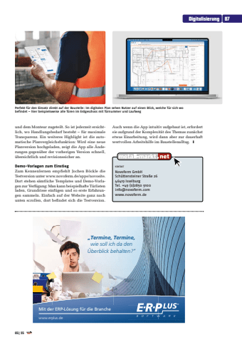 KONTAKTNovoferm GmbHSch%u00fcttensteiner Stra%u00dfe 2646419 IsselburgTel. +49 (0)2850 9100info@novoferm.comwww.novoferm.deund dem Monteur zugeteilt. So ist jederzeit ersichtlich, wo Handlungsbedarf besteht %u2013 f%u00fcr maximale Transparenz. Ein weiteres Highlight ist die automatische Planvergleichsfunktion: Wird eine neue Planversion hochgeladen, zeigt die App alle %u00c4nderungen gegen%u00fcber der vorherigen Version schnell, %u00fcbersichtlich und revisionssicher an.Demo-Vorlagen zum EinstiegZum Kennenlernen empfiehlt Jochen B%u00f6ckle die Testversion unter www.novoferm.de/apps/novosite. Dort stehen s%u00e4mtliche Templates und Demo-Vorlagen zur Verf%u00fcgung: Man kann beispielhafte T%u00fcrlisten laden, Grundrisse einf%u00fcgen und so erste Erfahrungen sammeln. Einfach auf der Website ganz nach unten scrollen, dort befindet sich die Testversion. Perfekt f%u00fcr den Einsatz direkt auf der Baustelle: Im digitalen Plan sehen Nutzer auf einen Blick, welche T%u00fcr sich wo befindet %u2013 hier beispielsweise alle T%u00fcren im Erdgeschoss mit T%u00fcrnummer und LaufwegAuch wenn die App intuitiv aufgebaut ist, erfordert sie aufgrund der Komplexit%u00e4t des Themas zun%u00e4chst etwas Einarbeitung, wird dann aber zur dauerhaft wertvollen Arbeitshilfe im Baustellenalltag. y%u201eTermine, Termine,wie soll ich da den %u00dcberblick behalten?%u201c%u00aewww.erplus.deMit der ERP-L%u00f6sung f%u00fcr die Branche%u00a9iStock%u00a9shutterstockAnzeigen_ERPlus.indd 2 01.02.21 11:21Digitalisierung 8705| 25