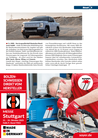 Die SDH %u2013 Servicegesellschaft Deutsches Handwerk GmbH %u2013 st%u00e4rkt als f%u00fchrendes Mobilit%u00e4tsportal f%u00fcr Handwerksunternehmen ihr Angebot und gibt die Aufnahme von f%u00fcnf neuen Fahrzeugmarken in ihr Portfolio bekannt. Stahl- und Metallbauern stehen nun Sonderkonditionen f%u00fcr den Erwerb eines Firmenwagens bei insgesamt 30 Fahrzeugmarken zur Verf%u00fcgung %u2013 ab sofort auch bei den Marken BYD, Ineos, Maxus, XPeng und Genesis.Gem%u00e4%u00df dem Slogan %u201eG%u00fcnstige Firmenwagen f%u00fcrs Handwerk%u201c unterst%u00fctzt die SDH seit mittlerweile knapp 15 Jahren Handwerksbetriebe beim Erwerb von Firmenfahrzeugen und verhilft ihnen zu den bestm%u00f6glichen Konditionen. Mit einem SDH-Abrufschein sichern sich Handwerker starke Rabatte von aktuell bis zu 35 Prozent sowie Zugang zu exklusiven SDH-Sonderaktionen. Dank Rahmenabkommen mit mittlerweile 30 Fahrzeugherstellern k%u00f6nnen SDH-Mitglieder ihren neuen Firmenwagen bequem lokal bei teilnehmenden Automobilvertragsh%u00e4ndlern erwerben. Den Abrufschein daf%u00fcr k%u00f6nnen Handwerker aller Gewerke einfach online unter www.sdh.de durch Vorlage ihrer gewerblichen Unterlagen beantragen. yFoto: SDH21. - 24. Oktober 2025Halle 9, Stand 9502MESSEStuttgartMADEINGERMANYBOLZENDIREKT VOMHERSTELLERSCHWEISSENsoyer.deAktuell 9