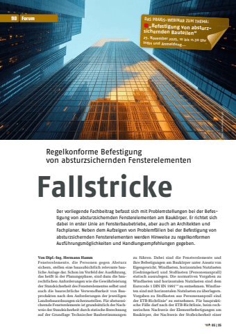 DAS PRAXIS-WEBINAR ZUM THEMA: %u201eBefestigung von absturzsichernden Bauteilen%u201c25. November 2025, 10 bis 11.30 UhrInfos und Anmeldung...Regelkonforme Befestigung von absturzsichernden FensterelementenFallstrickeDer vorliegende Fachbeitrag befasst sich mit Problemstellungen bei der Befestigung von absturzsichernden Fensterelementen am Bauk%u00f6rper. Er richtet sich dabei in erster Linie an Fensterbaubetriebe, aber auch an Architekten und Fachplaner. Neben dem Aufzeigen von Problemf%u00e4llen bei der Befestigung von absturzsichernden Fensterelementen werden Hinweise zu regelkonformen Ausf%u00fchrungsm%u00f6glichkeiten und Handlungsempfehlungen gegeben.Von Dipl.-Ing. Hermann HammFensterelemente, die Personen gegen Absturz sichern, stellen eine bauaufsichtlich relevante bauliche Anlage dar. Schon im Vorfeld der Ausf%u00fchrung, das hei%u00dft in der Planungsphase, sind dazu die baurechtlichen Anforderungen wie die Gew%u00e4hrleistung der Standsicherheit des Fensterelementes selbst und auch die baurechtliche Verwendbarkeit von Bauprodukten nach den Anforderungen der jeweiligen Landesbauordnungen sicherzustellen. F%u00fcr absturzsichernde Fensterelemente ist grunds%u00e4tzlich der Nachweis der Standsicherheit durch statische Berechnung auf der Grundlage Technischer Baubestimmungen zu f%u00fchren. Dabei sind die Fensterelemente und ihre Befestigungen am Bauk%u00f6rper unter Ansatz von Eigengewicht, Windlasten, horizontalen Nutzlasten (Gedr%u00e4ngelast) und Sto%u00dflasten (Personenanprall) statisch auszulegen. Die normativen Vorgaben zu Windlasten und horizontalen Nutzlasten sind dem Eurocode 1 DIN EN 19911,2 zu entnehmen. Windlasten sind mit horizontalen Nutzlasten zu %u00fcberlagern. Vorgaben zu Sto%u00dflasten aus Personenanprall sind der ETB-Richtlinie3 zu entnehmen. F%u00fcr baupraktische F%u00e4lle darf nach der ETB-Richtlinie, beim rechnerischen Nachweis der Elementbefestigungen am Bauk%u00f6rper, der Nachweis der Sto%u00dfsicherheit einer Foto: AdobeStock_btiger90 Forum05|25