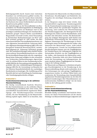 Befestigungsstelle durch Ansatz einer statischen Ersatzlast von 2,8 Kilonewton gef%u00fchrt werden. Es ist nachzuweisen, dass bei Ansatz dieser statischen Ersatzlast kein Versagen auftritt. Alternativ dazu darf der Nachweis der reinen Sto%u00dfsicherheit auch durch Bauteilversuche gef%u00fchrt werden.Die Anforderungen an die Verwendbarkeit von Bauprodukten wie Verankerungsmitteln zur Befestigung von Fensterelementen am Bauk%u00f6rper sind in den jeweiligen Landesbauordnungen der einzelnen Bundesl%u00e4nder geregelt. Danach d%u00fcrfen ausschlie%u00dflich Bauprodukte verwendet werden, deren Verwendung in Technischen Baubestimmungen wie EC34 oder EC95 normativ geregelt ist, oder solche, die %u00fcber einen baurechtlichen Verwendbarkeitsnachweis wie eine allgemeine bauaufsichtliche Zulassung (abZ), eine allgemeine Bauartgenehmigung (aBG) oder eine Europ%u00e4isch Technische Bewertung (ETA), nachstehend allgemein als %u201eZulassung%u201c bezeichnet, geregelt sind. Die Landesbauordnungen sehen dar%u00fcber hinaus einen weiteren Verwendbarkeitsnachweis vor, sofern f%u00fcr das betreffende Bauprodukt oder die vorgesehene Bauart keine Zulassung verf%u00fcgbar ist oder wesentlich von Technischen Baubestimmungen abgewichen wird. In solchen F%u00e4llen ist eine Zustimmung im Einzelfall (ZiE) f%u00fcr die Verwendung nicht geregelter Bauprodukte oder eine vorhabenbezogene Bauartgenehmigung (vBG) f%u00fcr die Anwendung von Bauarten bei der Obersten Bauaufsichtsbeh%u00f6rde des zust%u00e4ndigen Bundeslandes zu beantragen. Die Ausf%u00fchrung auf der Baustelle darf erst nach Zustellung des Zustimmungsoder Genehmigungsbescheides erfolgen.Problemfall 1:Fensterelementverankerung in der seitlichen MauerwerkslaibungDie h%u00e4ufig vorzufindende bauliche Situation, bei der Fensterelemente an der seitlichen Mauerwerkslaibung zu verankern sind, setzt voraus, dass ausschlie%u00dflich bauaufsichtlich zugelassene Befestigungs- oder Verankerungssysteme verwendet werden, die eine Verankerung an der Mauerwerkslaibung explizit regeln. Dabei ist zu beachten, dass die Parameter des Mauerwerks wie Mauerwerksart, Steinformat, Druckfestigkeit und Rohdichte den Vorgaben der jeweiligen Zulassung entsprechen m%u00fcssen. In der Baupraxis zeigt sich immer wieder, dass bauaufsichtlich zugelassene Verankerungsmittel f%u00fcr die Fensterelementverankerung verwendet werden, dabei jedoch die spezifischen Vorgaben der Zulassung, unter anderem die %u00dcbereinstimmung des Verankerungsgrundes, der Montageseite f%u00fcr das Einbringen des Ankers und der Randabst%u00e4nde, nicht beachtet oder %u00fcbersehen werden. Die Ber%u00fccksichtigung der richtigen Montageseite stellt hierbei eine wesentliche Voraussetzung dar. Die meisten verf%u00fcgbaren Zulassungen f%u00fcr Verankerungen in Hochlochziegeln setzen als Montageseite die Au%u00dfen- oder Innenseite des Mauerwerks voraus, nicht jedoch die Laibungsseite. Gerade bei hochd%u00e4mmenden Hochlochziegeln k%u00f6nnen sich die Tragf%u00e4higkeiten bei Verankerung an der Laibungsseite aufgrund der Steinstruktur deutlich von den Tragf%u00e4higkeiten an der Au%u00dfen- oder Innenseite des Mauersteins unterscheiden. Vermeiden lie%u00dfe sich diese Problematik durch die Verwendung von Laibungssteinen, die meist deutlich h%u00f6here Tragf%u00e4higkeiten bei Verankerung in der Laibung zulassen.Bei Mauerwerk aus filigranen Lochsteinen mit geringen Druckfestigkeiten ist die Verankerung in der Mauerwerkslaibung oftmals nicht realisierbar, da in den Zulassungen nur sehr geringe Tragf%u00e4higkeiten ausgewiesen werden. In solchen F%u00e4llen bietet sich ersatzweise die Verwendung eines bauaufsichtlich zugelassenen Verankerungssystems an, bei dem die Elementverankerungen %u00fcber Mauerklammern aus nichtrostendem Stahlblech erfolgt6, bei der keine Anker in der Laibung gesetzt werden.Problemfall 2: Untere Fensterelementverankerung auf der Mauerwerksbr%u00fcstungEbenfalls h%u00e4ufig vorzufinden sind bauliche Situationen, bei denen Fensterelemente auf der oberen Steinlage von Mauerwerksbr%u00fcstungen aufgesetzt und Auszug aus ETA-08/0190 Abbildung (A)11Mauerwerk ohne AuflastForum 9105 | 25