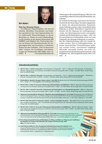 benbezogene Bauartgenehmigung (vBG) bei der zust%u00e4ndigen Obersten Bauaufsichtsbeh%u00f6rde einzuholen.Im Vorfeld der Montage sind durch den Fensterbaubetrieb die bauseitigen Verankerungsgr%u00fcnde, an denen die absturzsichernden Fensterelemente befestigt werden sollen, hinsichtlich ihrer Eignung zu pr%u00fcfen. Besonderes Augenmerk ist hierbei auf die Eignung des Laibungsmauerwerks, des Br%u00fcstungsmauerwerks und gegebenenfalls der Rollladenk%u00e4sten zu legen %u2013 dies, um die geschilderten Problemf%u00e4lle nicht erst zum Zeitpunkt der Montage behandeln zu m%u00fcssen.Bei der Geb%u00e4udeplanung sollte der Aspekt beachtet werden, dass in Laibungsbereichen, an denen absturzsichere Fensterelemente befestigt werden sollen, ausreichend tragf%u00e4higeBaustoffe verwendet werden, wie etwa Laibungssteine bei Hochlochziegelmauerwerk oder Ringanker bei %u201eBr%u00fcstungsmauerwerk ohne Auflast%u201c. yDer Autor: Dipl.-Ing. Hermann Hamm %u2026%u2026 ist erfahrener Tragwerksplaner, der sich auf Glasbau, Metallbau, Fassadenbau und Stahlbau spezialisiert hat. Sein Ingenieurb%u00fcro bietet umfassende Dienstleistungen in diesen Bereichen an. Hamm ist auch Lehrbeauftragter f%u00fcr Glasbau an der Dualen Hochschule BW (DHBW) und Mitglied des Technischen Beirats im Institut des Glaserhandwerks f%u00fcr Verglasungstechnik und Fensterbau in Hadamar. Hamm hat den Leitfaden %u201eGlas im Bauwesen 2025%u201c verfasst, der Grundlagen und Erl%u00e4uterungen zur Normenreihe DIN 18008, Teile 1-6, bietet. y www.glasstatik-hamm.de Foto: Ingenieurb%u00fcro Hamm Literaturverzeichnis:1. DIN EN 1991-1-1:2010-12. Eurocode 1: Einwirkungen auf Tragwerke %u2013 Teil 1-1: Allgemeine Einwirkungen auf Tragwerke %u2013 Wichten, Eigengewicht und Nutzlasten im Hochbau; Deutsche Fassung EN 1991-1-1:2002 + AC:2009. Berlin: Beuth Verlag. DOI: 10.31030/17190262. DIN EN 1991-1-4:2010-12. Eurocode 1: Einwirkungen auf Tragwerke %u2013 Teil 1-4: Allgemeine Einwirkungen %u2013 Windlasten; Deutsche Fassung EN 1991-1-4:2005 + A1:2010 + AC:2010. Berlin: Beuth Verlag. DOI: 10.31030/16255983. ETB-Richtlinie %u201eBauteile, die gegen Absturz sichern%u201d. Juni 1985. In: Muster-Liste der Technischen Baubestimmungen (MLTB), Teil 1, Anlage 1.3/1. Herausgegeben von der Bauministerkonferenz4. DIN EN 1993-1-1:2010-12. Eurocode 3: Bemessung und Konstruktion von Stahlbauten %u2013 Teil 1-1: Allgemeine Bemessungsregeln und Regeln f%u00fcr den Hochbau; Deutsche Fassung EN 1993-1-1:2005 + AC:2009. Berlin: Beuth Verlag. DOI: 10.31030/17239475. DIN EN 1999-1-1:2014-03. Eurocode 9: Bemessung und Konstruktion von Aluminiumtragwerken %u2013 Teil 1-1: Allgemeine Bemessungsregeln; Deutsche Fassung EN 1999-1-1:2007 + A1:2009 + A2:2013. Berlin: Beuth Verlag. DOI: 10.31030/20778246. Allgemeine bauaufsichtliche Zulassung / Allgemeine Bauartgenehmigung Nr. Z-14.4-806: Befestigungssystem JB-D%u00ae PLUS f%u00fcr die lastabtragende Fenster- und T%u00fcrenmontage sowie System JB-D/FA PLUS f%u00fcr die absturzsichernde Fenster- und T%u00fcrenmontage. Ausgestellt durch das Deutsche Institut f%u00fcr Bautechnik (DIBt), Oberursel, 27. Juni 2024. G%u00fcltig bis 27. Juni 20297. DIN EN 1996-3/NA:2019-12. Nationaler Anhang %u2013 National festgelegte Parameter %u2013 Eurocode 6: Bemessung und Konstruktion von Mauerwerksbauten %u2013 Teil 3: Vereinfachte Berechnungsmethoden f%u00fcr unbewehrte Mauerwerksbauten. Berlin: Beuth Verlag. DOI: 10.31030/31184638. DIN EN 1993-1-3:2010-12. Eurocode 3: Bemessung und Konstruktion von Stahlbauten %u2013 Teil 1-3: Allgemeine Regeln %u2013 Erg%u00e4nzende Regeln f%u00fcr kaltgeformte Bauteile und Bleche; Deutsche Fassung EN 1993-1-3:2006 + AC:2009. Berlin: Beuth Verlag. DOI: 10.31030/17185689. Allgemeine bauaufsichtliche Zulassung (abZ) Nr. Z-14.4-989: Befestigungssystem JB-W/XL f%u00fcr die absturzsichernde und lastabtragende Montage von Bauelementen aus Fensterrahmenprofilen; ausgestellt durch das Deutsche Institut f%u00fcr Bautechnik (DIBt), Oberursel, 4. Juni 2025, g%u00fcltig bis 4. Juni 203010.RAL-G%u00fctegemeinschaft Fenster und Haust%u00fcren e.V. (Hrsg.). Leitfaden zur Planung und Ausf%u00fchrung der Montage von Fenstern und Haust%u00fcren f%u00fcr Neubau und Renovierung. 2024. ISBN: 978-3-86791-486-511.Adolf W%u00fcrth GmbH & Co. KG. Europ%u00e4ische Technische Bewertung ETA-08/0190: W%u00fcrth Kunststoff-Rahmend%u00fcbel W-UR / SHARK UR. Kunststoffd%u00fcbel als Mehrfachbefestigung von nichttragenden Systemen zur Verankerung im Beton und Mauerwerk. Deutsches Institut f%u00fcr Bautechnik, Berlin. Ausgestellt am 5. September 2017 Foto: AdobeStock_Cheiraa94 Forum05|25