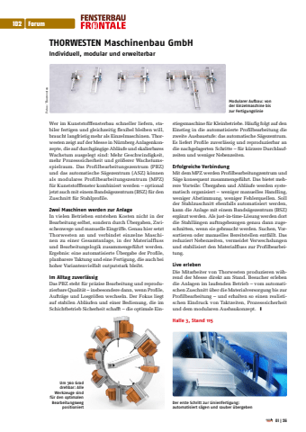 THORWESTEN Maschinenbau GmbHIndividuell, modular und erweiterbarWer im Kunststofffensterbau schneller liefern, stabiler fertigen und gleichzeitig flexibel bleiben will, braucht langfristig mehr als Einzelmaschinen. Thorwesten zeigt auf der Messe in N%u00fcrnberg Anlagenkonzepte, die auf durchg%u00e4ngige Abl%u00e4ufe und skalierbares Wachstum ausgelegt sind: Mehr Geschwindigkeit, mehr Prozesssicherheit und gr%u00f6%u00dferer Wachstumsspielraum. Das Profilbearbeitungszentrum (PBZ) und das automatische S%u00e4gezentrum (ASZ) k%u00f6nnen als modulares Profilbearbeitungszentrum (MPZ) f%u00fcr Kunststofffenster kombiniert werden %u2013 optional jetzt auch mit einem Bands%u00e4gezentrum (BSZ) f%u00fcr den Zuschnitt f%u00fcr Stahlprofile.Zwei Maschinen werden zur Anlage In vielen Betrieben entstehen Kosten nicht in der Bearbeitung selbst, sondern durch %u00dcbergaben, Zwischenwege und manuelle Eingriffe. Genau hier setzt Thorwesten an und verbindet einzelne Maschinen zu einer Gesamtanlage, in der Materialfluss und Bearbeitungslogik zusammengef%u00fchrt werden. Ergebnis: eine automatisierte %u00dcbergabe der Profile, planbarere Taktung und eine Fertigung, die auch bei hoher Variantenvielfalt outputstark bleibt.Im Alltag zuverl%u00e4ssigDas PBZ steht f%u00fcr pr%u00e4zise Bearbeitung und reproduzierbare Qualit%u00e4t %u2013 insbesondere dann, wenn Profile, Auftr%u00e4ge und Losgr%u00f6%u00dfen wechseln. Der Fokus liegt auf stabilen Abl%u00e4ufen und einer Bedienung, die im Schichtbetrieb Sicherheit schafft %u2013 die optimale Einstiegsmaschine f%u00fcr Kleinbetriebe. H%u00e4ufig folgt auf den Einstieg in die automatisierte Profilbearbeitung die zweite Ausbaustufe: das automatische S%u00e4gezentrum. Es liefert Profile zuverl%u00e4ssig und reproduzierbar an die nachgelagerten Schritte %u2013 f%u00fcr k%u00fcrzere Durchlaufzeiten und weniger Nebenzeiten. Erfolgreiche Verbindung Mit dem MPZ werden Profilbearbeitungzentrum und S%u00e4ge konsequent zusammengef%u00fchrt. Das bietet mehrere Vorteile: %u00dcbergaben und Abl%u00e4ufe werden systematisch organisiert %u2013 weniger manuelles Handling, weniger Abstimmung, weniger Fehlerquellen. Soll der Stahlzuschnitt ebenfalls automatisiert werden, kann die Anlage mit einem Bands%u00e4gezentrum (BSZ) erg%u00e4nzt werden. Als just-in-time-L%u00f6sung werden dort die Stahll%u00e4ngen auftragsbezogen genau dann zugeschnitten, wenn sie gebraucht werden. Suchen, Vorsortieren oder manuelles Bereitstellen entf%u00e4llt. Das reduziert Nebenzeiten, vermeidet Verwechslungen und stabilisiert den Materialfluss zur Profilbearbeitung.Live erlebenDie Mitarbeiter von Thorwesten produzieren w%u00e4hrend der Messe direkt am Stand. Besucher erleben die Anlagen im laufenden Betrieb %u2013 vom automatischen Zuschnitt %u00fcber die Materialversorgung bis zur Profilbearbeitung %u2013 und erhalten so einen realistischen Eindruck von Taktzeiten, Prozesssicherheit und dem modularen Ausbaukonzept. %u2759Halle 3, Stand 115Modularer Aufbau: von der Einzelmaschine bis zur Fertigungslinie Um 360 Grad drehbar: Alle Werkzeuge sind f%u00fcr den optimalen Bearbeitungsweg positioniertDer erste Schritt zur Linienfertigung: automatisiert s%u00e4gen und sauber %u00fcbergebenFotos: Thorwesten102 Forum01|26