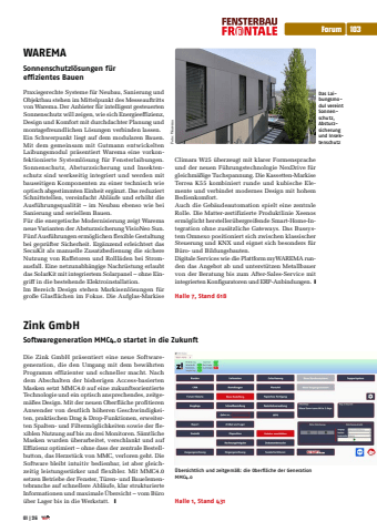 WAREMAPraxisgerechte Systeme f%u00fcr Neubau, Sanierung und Objektbau stehen im Mittelpunkt des Messeauftritts von Warema. Der Anbieter f%u00fcr intelligent gesteuerten Sonnenschutz will zeigen, wie sich Energieeffizienz, Design und Komfort mit durchdachter Planung und montagefreundlichen L%u00f6sungen verbinden lassen.Ein Schwerpunkt liegt auf dem modularen Bauen. Mit dem gemeinsam mit Gutmann entwickelten Laibungsmodul pr%u00e4sentiert Warema eine vorkonfektionierte Systeml%u00f6sung f%u00fcr Fensterlaibungen. Sonnenschutz, Absturzsicherung und Insektenschutz sind werkseitig integriert und werden mit bauseitigen Komponenten zu einer technisch wie optisch abgestimmten Einheit erg%u00e4nzt. Das reduziert Schnittstellen, vereinfacht Abl%u00e4ufe und erh%u00f6ht die Ausf%u00fchrungsqualit%u00e4t %u2013 im Neubau ebenso wie bei Sanierung und seriellem Bauen.F%u00fcr die energetische Modernisierung zeigt Warema neue Varianten der Absturzsicherung VisioNeo Sun. F%u00fcnf Ausf%u00fchrungen erm%u00f6glichen flexible Gestaltung bei gepr%u00fcfter Sicherheit. Erg%u00e4nzend erleichtert das SecuKit als manuelle Zusatzbedienung die sichere Nutzung von Raffstoren und Rolll%u00e4den bei Stromausfall. Eine netzunabh%u00e4ngige Nachr%u00fcstung erlaubt das SolarKit mit integriertem Solarpanel %u2013 ohne Eingriff in die bestehende Elektroinstallation.Im Bereich Design stehen Markisenl%u00f6sungen f%u00fcr gro%u00dfe Glasfl%u00e4chen im Fokus. Die Aufglas-Markise Climara W25 %u00fcberzeugt mit klarer Formensprache und der neuen F%u00fchrungstechnologie NexDrive f%u00fcr gleichm%u00e4%u00dfige Tuchspannung. Die Kassetten-Markise Terrea K55 kombiniert runde und kubische Elemente und verbindet modernes Design mit hohem Bedienkomfort.Auch die Geb%u00e4udeautomation spielt eine zentrale Rolle. Die Matter-zertifizierte Produktlinie Xeenos erm%u00f6glicht hersteller%u00fcbergreifende Smart-Home-Integration ohne zus%u00e4tzliche Gateways. Das Bussystem Omnexo positioniert sich zwischen klassischer Steuerung und KNX und eignet sich besonders f%u00fcr B%u00fcro- und Bildungsbauten.Digitale Services wie die Plattform myWAREMA runden das Angebot ab und unterst%u00fctzen Metallbauer von der Beratung bis zum After-Sales-Service mit integrierten Konfiguratoren und ERP-Anbindungen. %u2759Halle 7, Stand 618Zink GmbHSoftwaregeneration MMC4.0 startet in die ZukunftSonnenschutzl%u00f6sungen f%u00fcr effizientes BauenDas Laibungsmodul vereint Sonnenschutz, Absturzsicherung und Insek- Foto: WarematenschutzDie Zink GmbH pr%u00e4sentiert eine neue Softwaregeneration, die den Umgang mit dem bew%u00e4hrten Programm effizienter und schneller macht. Nach dem Abschalten der bisherigen Access-basierten Masken setzt MMC4.0 auf eine zukunftsorientierte Technologie und ein optisch ansprechendes, zeitgem%u00e4%u00dfes Design. Mit der neuen Oberfl%u00e4che profitieren Anwender von deutlich h%u00f6heren Geschwindigkeiten, praktischen Drag & Drop-Funktionen, erweiterten Spalten- und Filterm%u00f6glichkeiten sowie der flexiblen Nutzung auf bis zu drei Monitoren. S%u00e4mtliche Masken wurden %u00fcberarbeitet, verschlankt und auf Effizienz optimiert %u2013 ohne dass der zentrale Bestellbutton, das Herzst%u00fcck von MMC, verloren geht. Die Software bleibt intuitiv bedienbar, ist aber gleichzeitig leistungsst%u00e4rker und flexibler. Mit MMC4.0 setzen Betriebe der Fenster, T%u00fcren- und Bauelementebranche auf schnellere Abl%u00e4ufe, klar strukturierte Informationen und maximale %u00dcbersicht %u2013 vom B%u00fcro %u00fcber Lager bis in die Werkstatt. %u2759 Halle 1, Stand 431%u00dcbersichtlich und zeitgem%u00e4%u00df: die Oberfl%u00e4che der Generation MMC4.0Forum 10301 |26