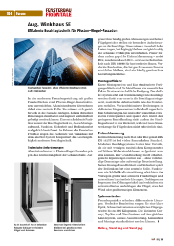 Aug. Winkhaus SEEffiziente Beschlagtechnik f%u00fcr Pfosten-Riegel-Fassaden In der modernen Fassadengestaltung mit gro%u00dfen Fensterfl%u00e4chen sind Pfosten-Riegel-Konstruktionen unverzichtbar. Aluminiumfenster %u00fcbernehmen dabei eine zentrale Rolle: Sie m%u00fcssen sich gestalterisch in die Fassade einf%u00fcgen, hohen statischen Belastungen standhalten und zugleich wirtschaftlich gefertigt werden k%u00f6nnen. Eine entscheidende Funktion kommt der Beschlagtechnik zu, da sie Montageaufwand, Funktion, Sicherheit und Bedienkomfort ma%u00dfgeblich beeinflusst. Im Rahmen der Fensterbau Frontale zeigen die Fachleute von Winkhaus mit dem aluPilot-System beispielhaft die Leistungsf%u00e4higkeit moderner Beschlagtechnik.Technische AnforderungenAluminiumfenster in Pfosten-Riegel-Fassaden pr%u00e4gen das Erscheinungsbild der Geb%u00e4udeh%u00fclle. Aufgrund ihrer h%u00e4ufig gro%u00dfen Abmessungen und hohen Fl%u00fcgelgewichte stellen sie besondere Anforderungen an die Beschl%u00e4ge. Diese m%u00fcssen dauerhaft hohe Lasten tragen, leichtg%u00e4ngig bleiben und gleichzeitig die schlanke Profiloptik unterst%u00fctzen. Planer fordern zudem gepr%u00fcfte Einbruchhemmung %u2013 meist RC2, zunehmend auch RC3 %u2013 sowie eine Bedienbarkeit nach DIN 18040 f%u00fcr barrierefreies Bauen. Verdeckte Bandseiten, die bei geschlossenem Fenster unsichtbar bleiben, sind ein h%u00e4ufig gew%u00fcnschtes Gestaltungsmerkmal.MontageeffizienzKurze Montagezeiten und klar strukturierte Fertigungsabl%u00e4ufe sind f%u00fcr Metallbauer ein wesentlicher Faktor f%u00fcr eine wirtschaftliche Fertigung. Das aluPilot-System setzt auf Frontalmontage: Die Beschl%u00e4ge werden direkt von vorne in die Beschlagnut eingesetzt, zus%u00e4tzliche Arbeitsschritte wie das Freistanzen entfallen. Vorkonfektionierte Treibstangen in definierten L%u00e4ngen ersetzen individuell zugeschnittene Schubstangen. Sie sind sofort einsetzbar, reduzieren Fehlerquellen und sparen Zeit. Durch den geringeren Bauteilumfang sinkt zudem der Handlingaufwand in der Werkstatt, w%u00e4hrend teure Stanzwerkzeuge f%u00fcr Fl%u00fcgelecken nicht erforderlich sind.EinbruchhemmungEinbruchhemmung nach RC2 oder RC3 gem%u00e4%u00df DIN EN 1627ff ist bei vielen Bauvorhaben Standard. Modulare Beschlagsysteme bieten hier Vorteile, da sie mit wenigen zus%u00e4tzlichen Komponenten auf h%u00f6here Widerstandsklassen aufger%u00fcstet werden k%u00f6nnen. Der Grundbeschlag bleibt erhalten, gezielte Erg%u00e4nzungen reichen aus %u2013 ohne vollst%u00e4ndige Demontage oder aufwendige Neueinstellung.Neben Montagefreundlichkeit und Sicherheit spielt der Bedienkomfort eine zentrale Rolle. Funktionen wie Schlie%u00dfkraftunterst%u00fctzung erleichtern das Verriegeln gro%u00dfer und schwerer Fensterfl%u00fcgel und unterst%u00fctzen barrierefreie L%u00f6sungen. Drehbegrenzer begrenzen den %u00d6ffnungswinkel und verhindern ein unkontrolliertes Aufschlagen der Fl%u00fcgel, etwa bei Wind oder gro%u00dfformatigen Elementen.SystemvariantenFassadenprojekte erfordern differenzierte L%u00f6sungen. Verdeckte Bandseiten sorgen f%u00fcr eine klare Optik, Schwerlastvarianten erm%u00f6glichen Fl%u00fcgelgewichte bis zu 300 Kilogramm. Die Varianten Concept, TopStar und Giant basieren auf dem gleichen Grundsystem, sodass Ausschreibung, Kalkulation und Montage standardisiert werden k%u00f6nnen. %u2759Halle 4, Stand 243 und Stand 345Hochwertige Fassaden: ohne effiziente Beschlagtechnik nicht realisierbarVerdeckt liegende Bandseiten bleiben bei geschlossenen Fenstern unsichtbarAuch dauerhaft hoch belastbar: Robuste Ecklager verbinden Fl%u00fcgel und RahmenFoto: Aug. Winkhaus104 Forum01|26