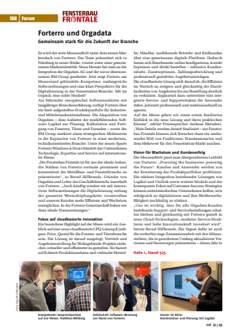Forterro und OrgadataGemeinsam stark f%u00fcr die Zukunft der BrancheEs wird der erste Messeauftritt unter dem neuen Markendach von Forterro: Das Team pr%u00e4sentiert sich in N%u00fcrnberg in neuer St%u00e4rke, vereint unter einer gemeinsamen Markenidentit%u00e4t. Neun Monate hat man an der Integration der Orgadata AG und der zuvor %u00fcbernommenen BM Group gearbeitet. Jetzt zeigt Forterro am Messestand geb%u00fcndelte Kompetenz, umfangreiche Softwarel%u00f6sungen und eine klare Perspektive f%u00fcr die Digitalisierung in der Fenestration-Branche. Mit im Gep%u00e4ck: eine echte Neuheit!Als f%u00fchrender europ%u00e4ischer Softwareanbieter mit langj%u00e4hriger Branchenerfahrung verf%u00fcgt Forterro %u00fcber ein breit aufgestelltes Produktportfolio f%u00fcr Industrieund Mittelstandsunternehmen. Die Akquisition von Orgadata %u2013 dem Anbieter der marktf%u00fchrenden Software Logikal zur Planung, Kalkulation und Fertigung von Fenstern, T%u00fcren und Fassaden %u2013 sowie der BM Group markiert einen strategischen Meilenstein in der Expansion von Forterro in einer modernen, technikorientierten Branche. Unter der neuen Sparte Forterro Windows & Doors b%u00fcndelt das Unternehmen Technologie, Expertise und Service auf internationaler Ebene.%u201eDie Fensterbau Frontale ist f%u00fcr uns der ideale Anlass, die St%u00e4rken von Forterro erstmals prominent und konzentriert der Metallbau- und Fensterbranche zu pr%u00e4sentieren%u201c, so Bernd Hillbrands, Gr%u00fcnder von Orgadata und Leiter des Gesch%u00e4ftsbereichs innerhalb von Forterro. %u201eAuch k%u00fcnftig werden wir mit innovativen Softwarel%u00f6sungen die Digitalisierung entlang der gesamten Wertsch%u00f6pfungskette vorantreiben und unseren Kunden mehr Effizienz und Wachstum erm%u00f6glichen. In der Forterro-Gemeinschaft haben wir dazu ideale Voraussetzungen.%u201cFokus auf cloudbasierte InnovationEin besonderes Highlight auf der Messe wird ein Ausblick auf eine neue cloudbasierte CPQ-L%u00f6sung (Configure, Price, Quote) f%u00fcr die Fenster- und T%u00fcrenbranche sein. Die L%u00f6sung ist darauf ausgelegt, Vertrieb und Angebotserstellung f%u00fcr Wohngeb%u00e4ude-Projekte einfacher, schneller und effizienter zu gestalten. Sie basiert auf Echtzeit-Produktionsdaten und verbindet Hersteller, H%u00e4ndler, ausf%u00fchrende Betriebe und Endkunden %u00fcber eine gemeinsame digitale Plattform. Dadurch lassen sich Bauelemente online konfigurieren, korrekt bepreisen und direkt bestellen %u2013 inklusive Kundenrabatte, Zusatzoptionen, Zahlungsabwicklung und professionell gestalteter Angebotsunterlagen.Die cloudbasierte L%u00f6sung zielt darauf ab, die Effizienz im Vertrieb zu steigern und gleichzeitig die Durchlaufzeiten von Angeboten bis zur Bestellung deutlich zu verk%u00fcrzen. Erg%u00e4nzend dazu unterst%u00fctzt eine integrierte Service- und Supportstruktur die Anwender dabei, jederzeit professionell und reaktionsschnell zu agieren.Auf der Messe geben wir einen ersten fundierten Einblick in die neue L%u00f6sung und ihren praktischen Einsatz%u201c, erkl%u00e4rt Pressesprecher Andreas Meinders. %u201eViele Details werden derzeit finalisiert %u2013 zur Fensterbau Frontale k%u00f6nnen sich Besucher dann ein umfassendes Bild von Funktionen, Einsatzszenarien und dem Mehrwert f%u00fcr den Fenestration-Markt machen.Vision f%u00fcr Wachstum und KundenerfolgDer Messeauftritt passt zum %u00fcbergeordneten Leitbild von Forterro: %u201ePowering the businesses powering the Future%u201c. Kunden und Anwender werden von der Erweiterung des Produktportfolios profitieren. Die st%u00e4rkere Integration bestehender L%u00f6sungen wie Logikal und Unilink sowie weitere Module und der konsequente Fokus auf Customer-Success-Strategien k%u00f6nnen mittelst%u00e4ndischen Unternehmen helfen, sich erfolgreich zu digitalisieren und ihre Wettbewerbsf%u00e4higkeit nachhaltig zu st%u00e4rken.%u201eUns ist wichtig, dass f%u00fcr alle Orgadata-Kunden bestehende Support- und Servicebeziehungen erhalten bleiben und gleichzeitig mit Forterro gezielt in neue Cloud-Technologien, moderne Service-Strukturen und hohe Innovationskraft investiert wird%u201c, betont Bernd Hillbrands. Ein Signal daf%u00fcr ist auch die weiterhin enge Zusammenarbeit mit den Mitausstellern, die in gewohntem Umfang aktualisierte Versionen und Neuerungen pr%u00e4sentieren %u2013 dieses Jahr in Halle 1, Stand 525Geb%u00fcndelt: Software-Beratung am Stand von ForterroKompetenter Ansprechpartner auf der Messe: Matthias WillbergImmer im Blick: Konstruktion und Planung mit LogikalFotos: Orgadata/Meinders106 Forum01|26