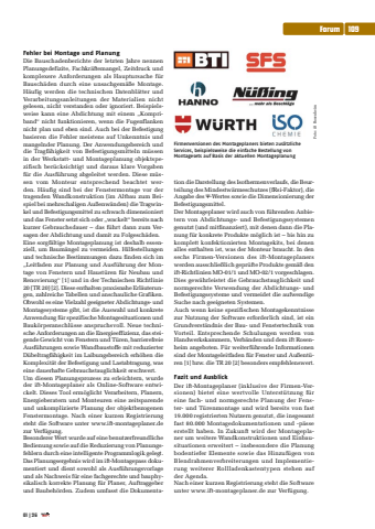 Fehler bei Montage und PlanungDie Bauschadenberichte der letzten Jahre nennen Planungsdefizite, Fachkr%u00e4ftemangel, Zeitdruck und komplexere Anforderungen als Hauptursache f%u00fcr Bausch%u00e4den durch eine unsachgem%u00e4%u00dfe Montage. H%u00e4ufig werden die technischen Datenbl%u00e4tter und Verarbeitungsanleitungen der Materialien nicht gelesen, nicht verstanden oder ignoriert. Beispielsweise kann eine Abdichtung mit einem %u201eKompriband%u201c nicht funktionieren, wenn die Fugenflanken nicht plan und eben sind. Auch bei der Befestigung basieren die Fehler meistens auf Unkenntnis und mangelnder Planung. Der Anwendungsbereich und die Tragf%u00e4higkeit von Befestigungsmitteln m%u00fcssen in der Werkstatt- und Montageplanung objektspezifisch ber%u00fccksichtigt und daraus klare Vorgaben f%u00fcr die Ausf%u00fchrung abgeleitet werden. Diese m%u00fcssen vom Monteur entsprechend beachtet werden. H%u00e4ufig sind bei der Fenstermontage vor der tragenden Wandkonstruktion (im Altbau zum Beispiel bei mehrschaligen Au%u00dfenw%u00e4nden) die Tragwinkel und Befestigungsmittel zu schwach dimensioniert und das Fenster setzt sich oder %u201ewackelt%u201c bereits nach kurzer Gebrauchsdauer %u2013 das f%u00fchrt dann zum Versagen der Abdichtung und damit zu Folgesch%u00e4den.Eine sorgf%u00e4ltige Montageplanung ist deshalb essenziell, um Baum%u00e4ngel zu vermeiden. Hilfestellungen und technische Bestimmungen dazu finden sich im %u201eLeitfaden zur Planung und Ausf%u00fchrung der Montage von Fenstern und Haust%u00fcren f%u00fcr Neubau und Renovierung%u201c [1] und in der Technischen Richtlinie 20 (TR 20) [2]. Diese enthalten praxisnahe Erl%u00e4uterungen, zahlreiche Tabellen und anschauliche Grafiken. Obwohl es eine Vielzahl geeigneter Abdichtungs- und Montagesysteme gibt, ist die Auswahl und konkrete Anwendung f%u00fcr spezifische Montagesituationen und Bauk%u00f6rperanschl%u00fcsse anspruchsvoll. Neue technische Anforderungen an die Energieeffizienz, das steigende Gewicht von Fenstern und T%u00fcren, barrierefreie Ausf%u00fchrungen sowie Wandbaustoffe mit reduzierter D%u00fcbeltragf%u00e4higkeit im Laibungsbereich erh%u00f6hen die Komplexit%u00e4t der Befestigung und Lastabtragung, was eine dauerhafte Gebrauchstauglichkeit erschwert.Um diesen Planungsprozess zu erleichtern, wurde der ift-Montageplaner als Online-Software entwickelt. Dieses Tool erm%u00f6glicht Verarbeitern, Planern, Energieberatern und Monteuren eine zeitsparende und unkomplizierte Planung der objektbezogenen Fenstermontage. Nach einer kurzen Registrierung steht die Software unter www.ift-montageplaner.de zur Verf%u00fcgung. Besonderer Wert wurde auf eine benutzerfreundliche Bedienung sowie auf die Reduzierung von Planungsfehlern durch eine intelligente Programmlogik gelegt. Das Planungsergebnis wird im ift-Montagepass dokumentiert und dient sowohl als Ausf%u00fchrungsvorlage und als Nachweis f%u00fcr eine fachgerechte und bauphysikalisch korrekte Planung f%u00fcr Planer, Auftraggeber und Baubeh%u00f6rden. Zudem umfasst die Dokumentation die Darstellung des Isothermenverlaufs, die Beurteilung des Mindestw%u00e4rmeschutzes (fRsi-Faktor), die Angabe des %u03a8-Wertes sowie die Dimensionierung der Befestigungsmittel.Der Montageplaner wird auch von f%u00fchrenden Anbietern von Abdichtungs- und Befestigungssystemen genutzt (und mitfinanziert), mit denen dann die Planung f%u00fcr konkrete Produkte m%u00f6glich ist %u2013 bis hin zu komplett konfektionierten Montagekits, bei denen alles enthalten ist, was der Monteur braucht. In den sechs Firmen-Versionen des ift-Montageplaners werden ausschlie%u00dflich gepr%u00fcfte Produkte gem%u00e4%u00df den ift-Richtlinien MO-01/1 und MO-02/1 vorgeschlagen. Dies gew%u00e4hrleistet die Gebrauchstauglichkeit und normgerechte Verwendung der Abdichtungs- und Befestigungssysteme und vermeidet die aufwendige Suche nach geeigneten Systemen.Auch wenn keine spezifischen Montagekenntnisse zur Nutzung der Software erforderlich sind, ist ein Grundverst%u00e4ndnis der Bau- und Fenstertechnik von Vorteil. Entsprechende Schulungen werden von Handwerkskammern, Verb%u00e4nden und dem ift Rosenheim angeboten. F%u00fcr weiterf%u00fchrende Informationen sind der Montageleitfaden f%u00fcr Fenster und Au%u00dfent%u00fcren [1] bzw. die TR 20 [2] besonders empfehlenswert.Fazit und AusblickDer ift-Montageplaner (inklusive der Firmen-Versionen) bietet eine wertvolle Unterst%u00fctzung f%u00fcr eine fach- und normgerechte Planung der Fenster- und T%u00fcrenmontage und wird bereits von fast 19.000 registrierten Nutzern genutzt, die insgesamt fast 80.000 Montagedokumentationen und -p%u00e4sse erstellt haben. In Zukunft wird der Montageplaner um weitere Wandkonstruktionen und Einbausituationen erweitert %u2013 insbesondere die Planung bodentiefer Elemente sowie das Hinzuf%u00fcgen von Blendrahmenverbreiterungen und Implementierung weiterer Rollladenkastentypen stehen auf der Agenda.Nach einer kurzen Registrierung steht die Software unter www.ift-montageplaner.de zur Verf%u00fcgung.Firmenversionen des Montageplaners bieten zus%u00e4tzliche Services, beispielsweise die einfache Bestellung von Montagesets auf Basis der aktuellen MontageplanungFoto: ift RosenheimForum 10901 |26