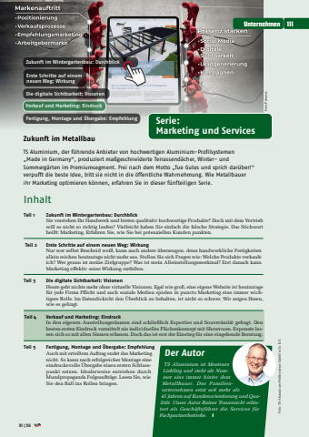 Unternehmen 111 Foto: PrimiereVerkauf und Marketing: EindruckFertigung, Montage und %u00dcbergabe: EmpfehlungZukunft im Wintergartenbau: DurchblickTeil 1 Zukunft im Wintergartenbau: DurchblickSie verstehen Ihr Handwerk und bieten qualitativ hochwertige Produkte? Doch mit dem Vertrieb will es nicht so richtig laufen? Vielleicht haben Sie einfach die falsche Strategie. Das Stichwort hei%u00dft: Marketing. Erfahren Sie, wie Sie bei potenziellen Kunden punkten.Teil 2 Erste Schritte auf einem neuen Weg: WirkungNur wer selbst Bescheid wei%u00df, kann auch andere %u00fcberzeugen, denn handwerkliche Fertigkeiten allein reichen heutzutage nicht mehr aus. Stellen Sie sich Fragen wie: Welche Produkte verkaufe ich? Wer genau ist meine Zielgruppe? Was ist mein Alleinstellungsmerkmal? Erst danach kann Marketing effektiv seine Wirkung entfalten.Teil 3 Die digitale Sichtbarkeit: VisionenHeute geht nichts mehr ohne virtuelle Visionen. Egal wie gro%u00df, eine eigene Website ist heutzutage f%u00fcr jede Firma Pflicht und auch soziale Medien spielen in puncto Marketing eine immer wichtigere Rolle. Im Datendickicht den %u00dcberblick zu behalten, ist nicht so schwer. Wir zeigen Ihnen, wie es gelingt.Teil 4 Verkauf und Marketing: EindruckIn den eigenen Ausstellungsr%u00e4umen sind schlie%u00dflich Expertise und Souver%u00e4nit%u00e4t gefragt. Den besten ersten Eindruck vermittelt ein individuelles Fl%u00e4chenkonzept mit Showroom. Exponate lassen sich so mit allen Sinnen erfassen. Doch das ist erst der Einstieg f%u00fcr eine eingehende Beratung.Teil 5 Fertigung, Montage und %u00dcbergabe: Empfehlung Foto: TS-Aluminium-Profilsysteme GmbH & Co. KGDer AutorTS Aluminium ist Monteurs Liebling und steht als Nummer eins immer hinter dem Metallbauer. Das Familienunternehmen setzt seit mehr als 45 Jahren auf Kundenorientierung und Qualit%u00e4t. Unser Autor Rainer Trauernicht erl%u00e4utert als Gesch%u00e4ftsf%u00fchrer die Services f%u00fcr Fachpartnerbetriebe. yAuch mit erteiltem Auftrag endet das Marketing nicht. So kann nach erfolgreicher Montage eine eindrucksvolle %u00dcbergabe einen ersten Schlusspunkt setzen. Idealerweise entstehen durch Mundpropaganda Folgeauftr%u00e4ge. Lesen Sie, wie Sie den Ball ins Rollen bringen.InhaltZukunft im MetallbauTS Aluminium, der f%u00fchrende Anbieter von hochwertigen Aluminium-Profilsystemen %u201eMade in Germany%u201c, produziert ma%u00dfgeschneiderte Terrassend%u00e4cher, Winter- und Sommerg%u00e4rten im Premiumsegment. Frei nach dem Motto %u201eTue Gutes und sprich dar%u00fcber!%u201c verpufft die beste Idee, tritt sie nicht in die %u00f6ffentliche Wahrnehmung. Wie Metallbauer ihr Marketing optimieren k%u00f6nnen, erfahren Sie in dieser f%u00fcnfteiligen Serie.Serie: Marketing und ServicesErste Schritte auf einem neuen Weg: WirkungDie digitale Sichtbarkeit: VisionenUnternehmen 11101 |26