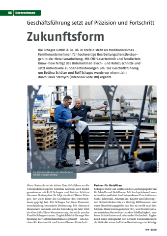 Gesch%u00e4ftsf%u00fchrung setzt auf Pr%u00e4zision und FortschrittZukunftsformDie Schages GmbH & Co. KG in Krefeld steht als traditionsreiches Familienunternehmen f%u00fcr hochwertige Bearbeitungsdienstleistungen in der Metallverarbeitung. Mit CNC-Lasertechnik und fundiertem Know-how fertigt das Unternehmen Blech- und Rohrzuschnitte und setzt individuelle Kundenanforderungen um. Die Gesch%u00e4ftsf%u00fchrung um Bettina Sch%u00fctze und Rolf Schages wurde vor einem Jahr durch Slava Statnych (Interview Seite 118) erg%u00e4nzt.Slava Statnych ist als dritter Gesch%u00e4ftsf%u00fchrer an die Unternehmensspitze berufen worden und bildet gemeinsam mit Rolf Schages und Bettina Sch%u00fctze die neue Dreierspitze. Er folgt damit auf Heinz Schages, der viele Jahre die Geschicke des Unternehmens gepr%u00e4gt hat. F%u00fcr Schages hat diese Personalentscheidung besondere Bedeutung: Mit Statnych %u00fcbernimmt erstmals seit der Gr%u00fcndung im Jahr 1956 ein Gesch%u00e4ftsf%u00fchrer Verantwortung, der nicht aus der Familie Schages stammt. Zugleich bleibt die enge Verbindung zur Unternehmerfamilie gewahrt %u2013 ein Zeichen f%u00fcr Kontinuit%u00e4t und kontrollierten Fortschritt.Partner f%u00fcr MetallbauSchages bietet ein umfassendes Leistungsspektrum f%u00fcr Metall- und Stahlbauer. Mit hochpr%u00e4zisem Laserschneiden realisiert das Unternehmen Zuschnitte aus Stahl, Edelstahl, Aluminium, Kupfer und Messing %u2013 mit Schnittdicken bis zu f%u00fcnfzig Millimetern und einer Bearbeitungsgr%u00f6%u00dfe von bis zu zw%u00f6lf mal drei Metern. Dank leistungsstarker CO2- und Festk%u00f6rperlaser entstehen Bauteile mit exakter Ma%u00dfhaltigkeit, sauberer Schnittkante und minimaler Nacharbeit. Erg%u00e4nzend dazu erm%u00f6glicht der Bereich Fasenschneiden ab 2026 die wirtschaftliche Bearbeitung von Schr%u00e4gDie Kommunikation mit Mitarbeitern ist bei Schages wichtigFotos: Schages116 Unternehmen01|26