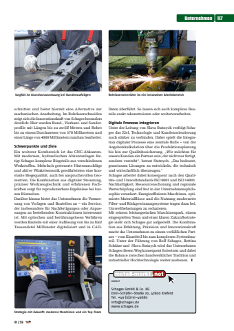 schnitten und bietet hiermit eine Alternative zur mechanischen Anarbeitung. Im Rohrlaserschneiden zeigt sich die Innovationskraft von Schages besonders deutlich: Hier werden Rund-, Vierkant- und Sonderprofile mit L%u00e4ngen bis zu zw%u00f6lf Metern und Rohre bis zu einem Durchmesser von 370 Millimetern und einer L%u00e4nge von 4000 Millimetern rundum bearbeitet.Schwerpunkte und ZieleEin weiterer Kernbereich ist das CNC-Abkanten. Mit modernen, hydraulischen Abkantanlagen fertigt Schages komplexe Biegeteile aus verschiedenen Werkstoffen. Mehrfach gesteuerte Hinteranschl%u00e4ge und aktive Winkelsensorik gew%u00e4hrleisten eine konstante Biegequalit%u00e4t, auch bei anspruchsvollen Geometrien. Die Kombination aus digitaler Steuerung, pr%u00e4ziser Werkzeugtechnik und erfahrenen Fachkr%u00e4ften sorgt f%u00fcr reproduzierbare Ergebnisse bei kurzen R%u00fcstzeiten.Dar%u00fcber hinaus bietet das Unternehmen die Vermessung von Vorlagen und Bauteilen an %u2013 ein Service, der insbesondere f%u00fcr Nachfertigungen oder Anpassungen an bestehenden Konstruktionen interessant ist. Mit optischen und ber%u00fchrungslosen Verfahren werden Bauteile mit einer Aufl%u00f6sung von bis zu f%u00fcnf Tausendstel Millimeter digitalisiert und in CADDaten %u00fcberf%u00fchrt. So lassen sich auch komplexe Bauteile exakt rekonstruieren oder weiterverarbeiten.Digitale Prozesse integrierenUnter der Leitung von Slava Statnych verfolgt Schages das Ziel, Technologie und Kundenorientierung noch st%u00e4rker zu verbinden. Dabei spielt die Integration digitaler Prozesse eine zentrale Rolle %u2013 von der Angebotskalkulation %u00fcber die Produktionsplanung bis hin zur Qualit%u00e4tssicherung. %u201eWir m%u00f6chten f%u00fcr unsere Kunden ein Partner sein, der nicht nur fertigt, sondern versteht%u201c, betont Statnych. %u201eDas bedeutet, gemeinsam L%u00f6sungen zu entwickeln, die technisch und wirtschaftlich %u00fcberzeugen.%u201cSchages arbeitet dabei konsequent nach den Qualit%u00e4ts- und Umweltstandards ISO 9001 und ISO 14001. Nachhaltigkeit, Ressourcenschonung und regionale Wertsch%u00f6pfung sind fest in der Unternehmensphilosophie verankert. Energieeffiziente Maschinen, optimierte Materialfl%u00fcsse und die Nutzung modernster Filter- und R%u00fcckgewinnungssysteme tragen dazu bei, Umweltbelastungen zu reduzieren.Mit seinem leistungsstarken Maschinenpark, einem eingespielten Team und einer klaren Zukunftsstrategie sieht sich Schages gut aufgestellt. Die Kombination aus Erfahrung, Pr%u00e4zision und Innovationskraft macht das Unternehmen zu einem verl%u00e4%u00dflichen Partner %u2013 vom Einzelteil bis zum komplexen Systembauteil. Unter der F%u00fchrung von Rolf Schages, Bettina Sch%u00fctze und Slava Statnych wird das Unternehmen Schages diesen Weg konsequent fortsetzen und dabei die Balance zwischen handwerklicher Tradition und industrieller Hochtechnologie weiter ausbauen. ySorgfalt ist Grundvoraussetzung bei Kundenauftr%u00e4gen Rohrlaserschneiden ist ein innovativer ArbeitsbereichStrategie mit Zukunft: moderne Maschinen und ein Top-TeamUnternehmen 11701 |26KONTAKTSchages GmbH & Co. KGEmil-Sch%u00e4fer-Stra%u00dfe 20, 47800 KrefeldTel. +49 (0)2151-49680info@schages.dewww.schages.de