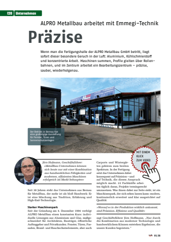 ALPRO Metallbau arbeitet mit Emmegi-TechnikPr%u00e4ziseWenn man die Fertigungshalle der ALPRO Metallbau GmbH betritt, liegt sofort dieser besondere Geruch in der Luft: Aluminium, K%u00fchlschmierstoff und konzentrierte Arbeit. Maschinen summen, Profile gleiten %u00fcber Rollenbahnen, und im Zentrum arbeitet ein Bearbeitungszentrum %u2013 pr%u00e4zise,sauber, wiederholgenau.Seit 30 Jahren steht das Unternehmen aus Bernau f%u00fcr Metallbau, der mehr ist als blo%u00df Handwerk: Er ist eine Mischung aus Tradition, Erfahrung und High-End-Technologie.Starker MaschinenparkSeit der Gr%u00fcndung am 4. Dezember 1994 verfolgt ALPRO Metallbau einen konstanten Kurs: individuelle L%u00f6sungen aus Aluminium und Glas, ma%u00dfgeschneidert f%u00fcr Architekten, Bautr%u00e4ger, %u00f6ffentliche Auftraggeber und Privatkunden. Fenster, T%u00fcren, Fassaden, Brand- und Rauchschutzelemente, aber auch Carports und Winterg%u00e4rten geh%u00f6ren zum breiten Spektrum. In der Fertigung setzt das Unternehmen dabei konsequent auf Pr%u00e4zision %u2013 und auf Technik, die diesen Anspruch m%u00f6glich macht. 22 Fachkr%u00e4fte arbeiten t%u00e4glich daran, Projekte termingerecht umzusetzen. Was ihnen dabei zur Seite steht, ist ein Maschinenpark, der sich sehen lassen kann: modern, kontinuierlich erweitert und klar ausgerichtet auf Qualit%u00e4t.%u00bbWorauf es in der Produktion wirklich ankommt, sind Pr%u00e4zision, Effizienz und Qualit%u00e4t%u00ab sagt Gesch%u00e4ftsf%u00fchrer J%u00f6rn Hoffmann. %u201eNur durch die Kombination aus moderner Technologie und handwerklichem K%u00f6nnen entstehen Ergebnisse, die unsere Kunden begeistern.%u201dMIT EINEM KLICK ZUM VIDEOJ%u00f6rn Hofmann, Gesch%u00e4ftsf%u00fchrer: %u00bbMetallbau-Unternehmen k%u00f6nnen sich heute nur mit einer Kombination aus handwerklichen F%u00e4higkeiten und modernen, effizienten Maschinen erfolgreich im Markt behaupten%u00abDer Betrieb in Bernau hat eine gro%u00dfz%u00fcgige Ausstellung f%u00fcr Fenster, T%u00fcren und Sonnenschutzanlagen120 Unternehmen01|26