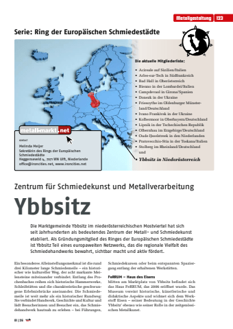 Serie: Ring der Europ%u00e4ischen Schmiedest%u00e4dteDie aktuelle Mitgliederliste:%u2022 Acireale auf Sizilien/Italien%u2022 Arles-sur-Tech in S%u00fcdfrankreich%u2022 Bad Hall in Ober%u00f6sterreich%u2022 Bienno in der Lombardei/Italien%u2022 Campdevaol in Girona/Spanien%u2022 Donezk in der Ukraine%u2022 Friesoythe im Oldenburger M%u00fcnsterland/Deutschland%u2022 Ivano Frankivsk in der Ukraine%u2022 Kolbermoor in Oberbayern/Deutschland %u2022 Lipnik in der Tschechischen Republik%u2022 Olbernhau im Erzgebirge/Deutschland%u2022 Oude IJsselstreek in den Niederlanden%u2022 Pratovecchio-Stia in der Toskana/Italien%u2022 Stolberg im Rheinland/Deutschland und %u2022 Ybbsitz in Nieder%u00f6sterreichZentrum f%u00fcr Schmiedekunst und MetallverarbeitungYbbsitzDie Marktgemeinde Ybbsitz im nieder%u00f6sterreichischen Mostviertel hat sich seit Jahrhunderten als bedeutendes Zentrum der Metall- und Schmiedekunst etabliert. Als Gr%u00fcndungsmitglied des Ringes der Europ%u00e4ischen Schmiedest%u00e4dte ist Ybbsitz Teil eines europaweiten Netzwerks, das die regionale Vielfalt des Schmiedehandwerks bewahrt, sichtbar macht und aktiv f%u00f6rdert.Ein besonderes Alleinstellungsmerkmal ist die rund drei Kilometer lange Schmiedemeile %u2013 ein historischer wie kultureller Weg, der acht markante Meilensteine miteinander verbindet. Entlang des Prochenbaches reihen sich historische Hammerwerke, Schleifst%u00e4tten und die charakteristische geschwungene Erlebnisbr%u00fccke aneinander. Die Schmiedemeile ist weit mehr als ein historischer Rundweg: Sie verbindet Handwerk, Geschichte und Kultur und l%u00e4dt Besucherinnen und Besucher ein, das Schmiedehandwerk hautnah zu erleben %u2013 bei F%u00fchrungen, Schmiedekursen oder beim entspannten Spaziergang entlang der erhaltenen Werkst%u00e4tten.FeRRUM %u2013 Haus des EisensMitten am Marktplatz von Ybbsitz befindet sich das Haus FeRRUM, das 2006 er%u00f6ffnet wurde. Das Museum vereint historische, k%u00fcnstlerische und didaktische Aspekte und widmet sich dem Werkstoff Eisen %u2013 seiner Bedeutung in der Geschichte Ybbsitz%u2019 ebenso wie seiner Rolle in der zeitgen%u00f6ssischen Metallkunst.Metallgestaltung 12301 |26KONTAKTMelinda MeijerSekret%u00e4rin des Rings der Europ%u00e4ischen Schmiedest%u00e4dteHeggenseveld 4, 7071 WN Ulft, Niederlandeoffice@ironcities.net, www.ironcities.net