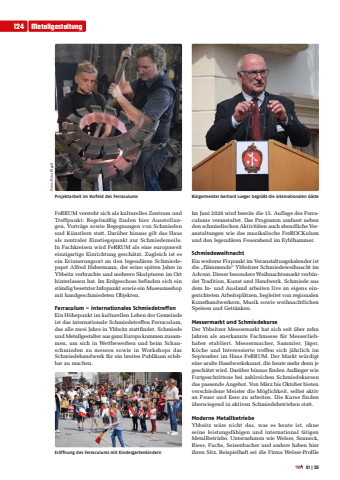 FeRRUM versteht sich als kulturelles Zentrum und Treffpunkt: Regelm%u00e4%u00dfig finden hier Ausstellungen, Vortr%u00e4ge sowie Begegnungen von Schmieden und K%u00fcnstlern statt. Dar%u00fcber hinaus gilt das Haus als zentraler Einstiegspunkt zur Schmiedemeile. In Fachkreisen wird FeRRUM als eine europaweit einzigartige Einrichtung gesch%u00e4tzt. Zugleich ist es ein Erinnerungsort an den legend%u00e4ren Schmiedepapst Alfred Habermann, der seine sp%u00e4ten Jahre in Ybbsitz verbrachte und mehrere Skulpturen im Ort hinterlassen hat. Im Erdgeschoss befinden sich ein st%u00e4ndig besetzter Infopunkt sowie ein Museumsshop mit handgeschmiedeten Objekten.Ferraculum %u2013 internationales SchmiedetreffenEin H%u00f6hepunkt im kulturellen Leben der Gemeinde ist das internationale Schmiedetreffen Ferraculum, das alle zwei Jahre in Ybbsitz stattfindet. Schmiede und Metallgestalter aus ganz Europa kommen zusammen, um sich in Wettbewerben und beim Schauschmieden zu messen sowie in Workshops das Schmiedehandwerk f%u00fcr ein breites Publikum erlebbar zu machen.Im Juni 2026 wird bereits die 15. Auflage des Ferraculums veranstaltet. Das Programm umfasst neben den schmiedischen Aktivit%u00e4ten auch abendliche Veranstaltungen wie das musikalische FerROCKulum und den legend%u00e4ren Feuerabend im Eyblhammer.SchmiedeweihnachtEin weiterer Fixpunkt im Veranstaltungskalender ist die %u201efl%u00e4mmende%u201c Ybbsitzer Schmiedeweihnacht im Advent. Dieser besondere Weihnachtsmarkt verbindet Tradition, Kunst und Handwerk. Schmiede aus dem In- und Ausland arbeiten live an eigens eingerichteten Arbeitspl%u00e4tzen, begleitet von regionalen Kunsthandwerkern, Musik sowie weihnachtlichen Speisen und Getr%u00e4nken.Messermarkt und SchmiedekurseDer Ybbsitzer Messermarkt hat sich seit %u00fcber zehn Jahren als anerkannte Fachmesse f%u00fcr Messerliebhaber etabliert. Messermacher, Sammler, J%u00e4ger, K%u00f6che und Interessierte treffen sich j%u00e4hrlich im September im Haus FeRRUM. Der Markt w%u00fcrdigt eine uralte Handwerkskunst, die heute mehr denn je gesch%u00e4tzt wird. Dar%u00fcber hinaus finden Anf%u00e4nger wie Fortgeschrittene bei zahlreichen Schmiedekursen das passende Angebot. Von M%u00e4rz bis Oktober bieten verschiedene Meister die M%u00f6glichkeit, selbst aktiv an Feuer und Esse zu arbeiten. Die Kurse finden %u00fcberwiegend in aktiven Schmiedebetrieben statt.Moderne MetallbetriebeYbbsitz w%u00e4re nicht das, was es heute ist, ohne seine leistungsf%u00e4higen und international t%u00e4tigen Metallbetriebe. Unternehmen wie Welser, Sonneck, Riess, Fuchs, Seisenbacher und andere haben hier ihren Sitz. Beispielhaft sei die Firma Welser-Profile Projektarbeit im Vorfeld des Ferraculums B%u00fcrgermeister Gerhard Lueger begr%u00fc%u00dft die internationalen G%u00e4steEr%u00f6ffnung des Ferraculums mit Kindergartenkindern124 Metallgestaltung01|26Fotos: Peter Elga%u00df