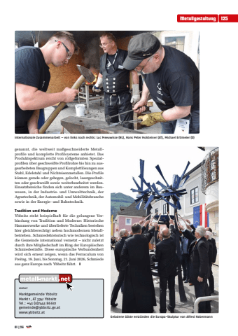 genannt, die weltweit ma%u00dfgeschneiderte Metallprofile und komplette Profilsysteme anbietet. Das Produktspektrum reicht von rollgeformten Spezialprofilen %u00fcber geschwei%u00dfte Profilrohre bis hin zu ausgearbeiteten Baugruppen und Komplettl%u00f6sungen aus Stahl, Edelstahl und Nichteisenmetallen. Die Profile k%u00f6nnen gerade oder gebogen, gelocht, lasergeschnitten oder geschwei%u00dft sowie weiterbearbeitet werden. Einsatzbereiche finden sich unter anderem im Bauwesen, in der Industrie- und Umwelttechnik, der Agrartechnik, der Automobil- und Mobilit%u00e4tsbranche sowie in der Energie- und Bahntechnik.Tradition und Moderne Ybbsitz steht beispielhaft f%u00fcr die gelungene Verbindung von Tradition und Moderne: Historische Hammerwerke und %u00fcberlieferte Techniken bestehen hier gleichberechtigt neben hochmodernen Metallbetrieben. Schmiedehistorisch wie technologisch ist die Gemeinde international vernetzt %u2013 nicht zuletzt durch ihre Mitgliedschaft im Ring der Europ%u00e4ischen Schmiedest%u00e4dte. Diese europ%u00e4ische Verbundenheit wird sich erneut zeigen, wenn das Ferraculum von Freitag, 19. Juni, bis Sonntag, 21. Juni 2026, Schmiede aus ganz Europa nach Ybbsitz f%u00fchrt. yInternationale Zusammenarbeit %u2013 von links nach rechts: Luc Meeuwisse (NL), Hans Peter Holsteiner (AT), Michael Ertlmeier (D)Geladene G%u00e4ste entz%u00fcnden die Europa-Skulptur von Alfred HabermannMetallgestaltung 12501 |26KONTAKTMarktgemeinde YbbsitzMarkt 1, AT 3341 YbbsitzTel.: +43 (0)7443 86601gemeinde@ybbsitz.gv.atwww.ybbsitz.at