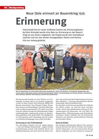 126 Metallgestaltung01|26Neue Stele erinnert an Bauernkrieg 1525ErinnerungImmenstadt hat ein neues sichtbares Zeichen der Erinnerungskultur: Auf dem Kirchplatz wurde eine Stele zur Erinnerung an den Bauernkrieg vor 500 Jahren aufgestellt. Das Projekt wurde vom Heimatbund realisiert und von den beiden Feuergestaltern Martin und Martina Fritz aus Imberg gestaltet. Das Kunstwerk besteht aus drei Platten aus Cortenstahl, in denen oben je ein Fenster ausgespart wurde. In diese Fenster sind stilisierte Waffen der Bauern einmontiert: Zum Beispiel Pr%u00fcgel, Heugabeln, Sensen und Dreschflegel. Alle diese Elemente sind aus Bronze geschmiedet. Die Stelen sind dem Logo der Aktion Courage des Heimatbundes Allg%u00e4u nachempfunden. Immenstadt spielte im Bauernkrieg mehrfach eine gro%u00dfe Rolle. Die Burgherren von Werdenstein und Laubenberg und die Grafen von Montfort-K%u00f6nigsegg waren direkt betroffen.Erinnerung an den Freiheitskampf Vor 500 Jahren erhoben sich im Allg%u00e4u Bauern %u2013 und auch B%u00fcrger Immenstadts %u2013 gegen feudale Unterdr%u00fcckung und f%u00fcr mehr Freiheit, Recht und Selbstbestimmung. Die neue Stele soll daran erinnern, dass der Einsatz f%u00fcr Freiheit damals wie heute Mut erforderte %u2013 und dass demokratische Rechte keineswegs selbstverst%u00e4ndlich sind.Der Standort wurde bewusst gew%u00e4hlt: Das Geb%u00e4ude des Hotels Lamm, vor dem die Stele errichtet wurde, diente %u00fcber Jahrhunderte hinweg als Versammlungsort f%u00fcr Menschen, die sich aktiv f%u00fcr B%u00fcrgerrechte, Mitbestimmung und Demokratie einsetzten. Damit verbindet der Ort historische Tradition und aktuelle gesellschaftliche Haltung auf besondere Weise.Kunst als Br%u00fccke Der Schmied und K%u00fcnstler Martin Fritz spielt in seinem Entwurf mit klaren Formen und symbolischen Elementen, die den historischen Bezug ebenso aufgreifen wie den modernen Anspruch, Foto: Peter Elga%u00dfBei der Einweihung: (v.l.) Karl Fleschutz (Ausschuss Heimatbund), Martin Fritz (Schmied und Gestalter), B%u00fcrgermeister Nico Sentner (Stadt Immenstadt), Richard Schindele (Heimatverein), Martina Fritz (Gestaltung), Karl Milz (Vorsitzender Heimatbund), Heinz Buhmann (Beisitzer Heinmatbund), Gerhard Klein (Stadtarchiv)