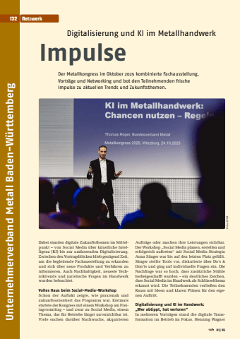 %u00abw Unternehmerverband Metall Baden-W%u00fcrttembergDigitalisierung und KI im MetallhandwerkImpulseDer Metallkongress im Oktober 2025 kombinierte Fachausstellung, Vortr%u00e4ge und Networking und bot den Teilnehmenden frische Impulse zu aktuellen Trends und Zukunftsthemen.Fotos: BVMDabei standen digitale Zukunftsthemen im Mittelpunkt %u2013 von Social Media %u00fcber k%u00fcnstliche Intelligenz (KI) bis zur umfassenden Digitalisierung. Zwischen den Vortragsbl%u00f6cken blieb gen%u00fcgend Zeit, um die begleitende Fachausstellung zu erkunden und sich %u00fcber neue Produkte und Verfahren zu informieren. Auch Nachhaltigkeit, neueste Techniktrends und juristische Fragen im Handwerk wurden beleuchtet.Volles Haus beim Social-Media-WorkshopSchon der Auftakt zeigte, wie praxisnah und zukunftsorientiert das Programm war. Erstmals startete der Kongress mit einem Workshop am Freitagvormittag %u2013 und zwar zu Social Media, einem Thema, das f%u00fcr Betriebe l%u00e4ngst unverzichtbar ist. Viele suchen dar%u00fcber Nachwuchs, akquirieren Auftr%u00e4ge oder machen ihre Leistungen sichtbar.Der Workshop %u201eSocial Media planen, erstellen und erfolgreich auftreten%u201c mit Social Media Strategin Anna S%u00e4nger war bis auf den letzten Platz gef%u00fcllt. S%u00e4nger stellte Tools vor, diskutierte %u00fcber Do%u2019s & Don%u2019ts und ging auf individuelle Fragen ein. Die Nachfrage war so hoch, dass zus%u00e4tzliche St%u00fchle herbeigeschafft wurden %u2013 ein deutliches Zeichen, dass Social Media im Handwerk als Schl%u00fcsselthema erkannt wird. Die Teilnehmenden verlie%u00dfen den Raum mit Ideen und klaren Pl%u00e4nen f%u00fcr den eigenen Auftritt.Digitalisierung und KI im Handwerk: %u201eWer abtippt, hat verloren%u201cIn mehreren Vortr%u00e4gen stand die digitale Transformation im Betrieb im Fokus. Henning Wagner 132 Netzwerk01|26