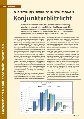 Fachverband Metall Nordrhein-WestfalenKonjunkturblitzlichtKein Stimmungsumschwung im MetallhandwerkAuch zum Jahreswechsel 2025/2026 zeichnet sich kein Stimmungsumschwung im nordrhein-westf%u00e4lischen Metallhandwerk ab. Dies zeigt das aktuelle Konjunkturblitzlicht des Fachverbandes Metall NW. Gerade einmal jedes zehnte Unternehmen rechnet f%u00fcr 2026 mit einer signifikanten Verbesserung der eigenen wirtschaftlichen Lage.Konstant herausfordernd war das Jahr 2025 insbesondere f%u00fcr die Maschinenbauer im Verband: Die durchschnittliche Beurteilung der aktuellen wirtschaftlichen Lage lag hier durchgehend schlechter als im %u00fcbrigen Metallhandwerk %u2013 bei rund 3,7 nach dem Schulnotenprinzip. Zum Jahreswechsel betr%u00e4gt der Wert sogar 3,79. Mit einem Wert von 3,24 beurteilen die Metallbauer ihre wirtschaftliche Lage zwar etwas besser, jedoch keineswegs optimistisch. Jeder dritte Metallbauer und jeder zweite Feinwerkmechaniker kann nicht einmal eine befriedigende Lage feststellen.Auch bei den Aussichten auf das Jahr 2026 bleiben die Metaller %u00fcberwiegend skeptisch: Rund 43 Prozent der Metallbauer und jeder zweite Feinwerkmechaniker erwarten keine signifikanten Ver%u00e4nderungen. Verbesserungen werden lediglich von 9,5 Prozent der baunahen Unternehmen und von 14,3 Prozent der Maschinenbauer erwartet. Parallel dazu hat sich die Investitionsneigung weiter verschlechtert: Nur noch 30 Prozent der Betriebe planen f%u00fcr 2026 gr%u00f6%u00dfere Investitionen.Urs%u00e4chlich hierf%u00fcr sind auch die zentralen Herausforderungen, die die Unternehmen im Metallhandwerk weiterhin stark belasten. Nach wie vor stellen die B%u00fcrokratiekosten (73,21 Prozent) und der Fachkr%u00e4ftemangel (62,5 Prozent) die gr%u00f6%u00dften Belastungsfaktoren dar. Dicht dahinter folgen der weiter zunehmende Preiswettbewerb beim Kunden (55,36 Prozent) sowie ein bef%u00fcrchteter Auftragsmangel, den jedes zweite Unternehmen wahrnimmt. Bei den feinwerkmechanischen Betrieben kommen zudem die steigenden Kosten f%u00fcr Zulieferungen hinzu, die von 64,29 Prozent genannt werden. %u201eDas Jahr 2025 war ein schwieriges Jahr f%u00fcr viele metallhandwerkliche Unternehmen. Gerade der Maschinen- und Anlagenbau sowie die Zulieferer der Automobilindustrie und der Fahrzeugbau hatten mit erheblichen Herausforderungen zu k%u00e4mpfen. Leider ist zum Jahreswechsel kein Stimmungsumschwung festzustellen. Einzig im Ausbildungsbereich hat sich die Situation etwas entspannt %u201c, kommentiert Stephan Lohmann, Gesch%u00e4ftsf%u00fchrer des Fachverbandes Metall NW, die aktuellen Ergebnisse. Es bestehe weiterhin deutlicher Handlungsbedarf seitens der Politik: %u00bbDie Lohnzusatzkosten m%u00fcssen endlich sinken, die notwendigen Reformen der sozialen Sicherungssysteme m%u00fcssen sich konsequent darauf konzentrieren %u2013 und die %u00dcberb%u00fcrokratisierung muss deutlich abgebaut werden%u00ab Grafiken: Fachverband Metall NW01|26134 Netzwerk