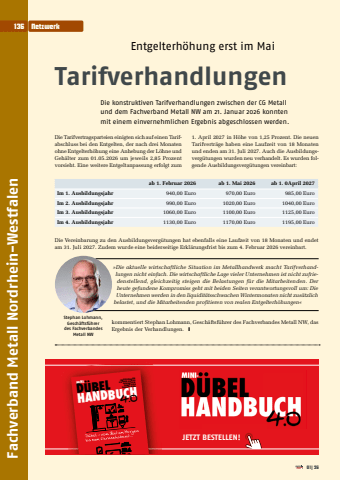 Fachverband Metall Nordrhein-WestfalenTarifverhandlungenEntgelterh%u00f6hung erst im MaiDie konstruktiven Tarifverhandlungen zwischen der CG Metall und dem Fachverband Metall NW am 21. Januar 2026 konnten mit einem einvernehmlichen Ergebnis abgeschlossen werden.Die Tarifvertragsparteien einigten sich auf einen Tarifabschluss bei den Entgelten, der nach drei Monaten ohne Entgelterh%u00f6hung eine Anhebung der L%u00f6hne und Geh%u00e4lter zum 01.05.2026 um jeweils 2,85 Prozent vorsieht. Eine weitere Entgeltanpassung erfolgt zum 1. April 2027 in H%u00f6he von 1,25 Prozent. Die neuen Tarifvertr%u00e4ge haben eine Laufzeit von 18 Monaten und enden am 31. Juli 2027. Auch die Ausbildungsverg%u00fctungen wurden neu verhandelt. Es wurden folgende Ausbildungsverg%u00fctungen vereinbart:ab 1. Februar 2026 ab 1. Mai 2026 ab 1. 0April 2027Im 1. Ausbildungsjahr 940,00 Euro 970,00 Euro 985,00 Euro Im 2. Ausbildungsjahr 990,00 Euro 1020,00 Euro 1040,00 Euro Im 3. Ausbildungsjahr 1060,00 Euro 1100,00 Euro 1125,00 EuroIm 4. Ausbildungsjahr 1130,00 Euro 1170,00 Euro 1195,00 EuroDie Vereinbarung zu den Ausbildungsverg%u00fctungen hat ebenfalls eine Laufzeit von 18 Monaten und endet am 31. Juli 2027. Zudem wurde eine beiderseitige Erkl%u00e4rungsfrist bis zum 4. Februar 2026 vereinbart.%u00bbDie aktuelle wirtschaftliche Situation im Metallhandwerk macht Tarifverhandlungen nicht einfach. Die wirtschaftliche Lage vieler Unternehmen ist nicht zufriedenstellend, gleichzeitig steigen die Belastungen f%u00fcr die Mitarbeitenden. Der heute gefundene Kompromiss geht mit beiden Seiten verantwortungsvoll um: Die Unternehmen werden in den liquidit%u00e4tsschwachen Wintermonaten nicht zus%u00e4tzlich belastet, und die Mitarbeitenden profitieren von realen Entgelterh%u00f6hungen%u00abkommentiert Stephan Lohmann, Gesch%u00e4ftsf%u00fchrer des Fachverbandes Metall NW, das Ergebnis der Verhandlungen. %u2759Stephan Lohmann, Gesch%u00e4ftsf%u00fchrerdes FachverbandesMetall NWJETZT BESTELLEN!%u00fcbelhandbuch4.0MiniD%u00fcbelhandbuchJ%u00fcrgen K%u00fcenzlenEckehard Scheller Rainer Becker7KRPDV%u0102.XKQ Thorsten Immel4.0Duebelbuch_210x74_Anschnitt.qxp_Layout 1 28.07.22 13:24 Seite 201|26136 Netzwerk