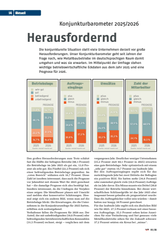 Auftragseing%u00e4ngeplusgleichminusQuelle: metall-markt.netPROGNOSE37,2 %27,5 %35,3 %34,6 %34,6 %30,8 %2025 2026Betriebslagesehr gutgutbefriedigendunbefriedigendPROGNOSEQuelle: metall-markt.net16,7 %35,2 %31,5 %16,7 % 16,6 %13,0 %48,1 %22,2 %2025 2026Ums%u00e4tzeplusgleichminusQuelle: metall-markt.netPROGNOSE30,2 %43,4 %26,4 %35,2 %38,9 %25,9 %2025 2026Zahl derMitarbeiterplusgleichminus18,5 %24,1 %57,4 %13,9 %18,5 %68,5 %PROGNOSE2025 2026Quelle: metall-markt.netDen gro%u00dfen Herausforderungen zum Trotz sch%u00e4tzt fast die H%u00e4lfte der befragten Betriebe (48,1 Prozent) die Betriebslage im Jahr 2025 als gut ein, 13,0 Prozent als sehr gut. Ein F%u00fcnftel (22,2 Prozent) sah sich einer befriedigenden Betriebslage gegen%u00fcber. Im %u201eroten Bereich%u201c w%u00e4hnten sich 16,7 Prozent. Diese Zahl ist insofern interessant, dass auch die Prognose vor Jahresfrist mit diesem Wert f%u00fcr 2025 gerechnet hat %u2013 die damalige Prognose sich also best%u00e4tigt hat. Insofern interessant, da die Umfragen der Vorjahre eines zeigen: Die Metallbauer planen mit Umsicht und melden eher konservative Sch%u00e4tzungen. Diesmal zeigt sich ein anderes Bild, wenn man auf die Betriebslage blickt. Die Erwartungen, die die Unternehmen in der Konjunkturumfrage f%u00fcr 2025 hatten, erf%u00fcllten sich weitestgehend.Verhaltener fallen die Prognosen f%u00fcr 2026 aus. Der Anteil, der mit unbefriedigenden (16,6 Prozent) oder befriedigenden betriebswirtschaftlichen Kennzahlen (31,5 Prozent) rechnet, steigt %u2013 verglichen mit dem vergangenen Jahr. Deutlicher weniger Unternehmen (35,2 Prozent statt 48,1 Prozent in 2025) erwarten eine gute Betriebslage. Sehr optimistisch mit einem %u201esehr gut%u201c starten 16,7 Prozent ins laufende Jahr.Bei den Auftragseing%u00e4ngen ergibt sich f%u00fcr das zur%u00fcckliegende Jahr bei zwei Dritteln der Befragten ein positives Bild. Sie hatten mehr (34,6 Prozent) oder zumindest gleich viele (34,6 Prozent) Auftr%u00e4ge als im Jahr davor. Ein Minus musste ein Drittel (30,8 Prozent) der Betriebe hinnehmen. Bei dieser wirtschaftlichen Schl%u00fcsselgr%u00f6%u00dfe ist das Jahr 2025 aber insgesamt besser gelaufen als prognostiziert wurde: Dass die Auftragsb%u00fccher voller sein w%u00fcrden %u2013 damit hatten nur knapp 18 Prozent gerechnet.F%u00fcr das laufende Jahr ergibt sich ein %u00e4hnliches Bild wie f%u00fcr 2025. 27,5 Prozent rechnen mit einer besseren Auftragslage, 35,3 Prozent sehen keine Anzeichen f%u00fcr eine Ver%u00e4nderung und fast genauso viele Metallbaubetriebe sehen f%u00fcr die Zukunft schwarz: 37,2 Prozent setzten ein Kreuz bei %u201eminus%u201c.Konjunkturbarometer 2025/2026HerausforderndDie konjunkturelle Situation stellt viele Unternehmen derzeit vor gro%u00dfe Herausforderungen. Unser Konjunkturbarometer geht seit Jahren der Frage nach, wie Metallbaubetriebe im deutschsprachigen Raum damit umgehen und was sie erwarten. Im Mittelpunkt der Umfrage stehen wichtige betriebswirtschaftliche Eckdaten aus dem Jahr 2025 und eine Prognose f%u00fcr 2026.14 Aktuell01|26