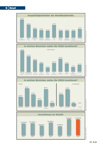 Quelle: metall-markt.net Quelle: metall-markt.net Quelle: metall-markt.net Quelle: metall-markt.netIn welchen Bereichen wollen Sie 2026 investieren?FERTIGUNG35,2 %25,9 %18,5 %29,6 %20,4 %16,7 %9,3 % 11,1 %18,5 %48,1 %Mehrfachnennungen m%u00f6glichDigitalisierungSchwei%u00dftechnikSchneidtechnikHandwerkzeugeAutomatisierungProfilbearbeitungBiegetechnikS%u00e4getechnikBlechbearbeitungWerkstatt sonstigeallgemeinIn welchen Bereichen wollen Sie 2026 investieren?B%u00dcRO FUHRPARK37,0%25,9 %0,0 %7,4 % 5,6 %13,0 %38,9 %20,4 %40,7 %25,9 %Mehrfachnennungen m%u00f6glichDigitalisierungAusstattung Computer Software CAD-System sonstige Pkw Transporter Lkw sonstigeInvestitionen im Schnitt53.220 %u20ac 54.200 %u20ac43.070 %u20ac58.780 %u20ac41.830 %u20ac75.140 %u20ac 74.640 %u20ac2020 2021 2022 2023 2024 2025 2026Hauptt%u00e4tigkeitsfelder der MetallbaubetriebeMehrfachnennungen m%u00f6glich63,0 %29,6 %44,4 %25,9%StahlbauAluminiumbauFenster/Fassade24,1 %Wintergartenbau44,4%T%u00fcr/Tor24,1 %Brandschutz24,1 %Metallgestaltung24,1 %Sonnenschutz31,5 %Bau- sonstigeschlosserei16 Aktuell01|26