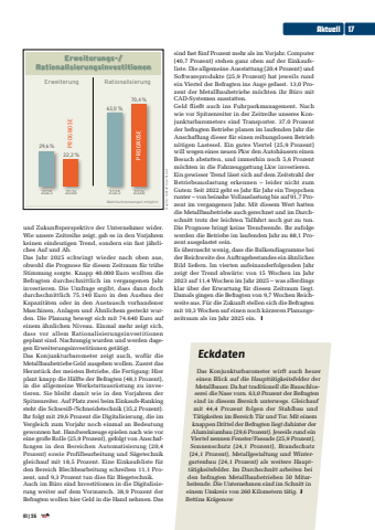 Quelle: metall-markt.netErweiterungs-/RationalisierungsinvestitionenErweiterung Rationalisierung29,6 %22,2 %63,0 %70,4 %Mehrfachnennungen m%u00f6glich2025 2026 2025 2026PROGNOSE PROGNOSEEckdatenDas Konjunkturbarometer wirft auch heuer einen Blick auf die Hauptt%u00e4tigkeitsfelder der Metallbauer. Da hat traditionell die Bauschlosserei die Nase vorn. 63,0 Prozent der Befragten sind in diesem Bereich unterwegs. Gleichauf mit 44,4 Prozent folgen der Stahlbau und T%u00e4tigkeiten im Bereich T%u00fcr und Tor. Mit einem knappen Drittel der Befragten liegt dahinter der Aluminiumbau (29,6 Prozent). Jeweils rund ein Viertel nennen Fenster/Fassade (25,9 Prozent), Sonnenschutz (24,1 Prozent), Brandschutz (24,1 Prozent), Metallgestaltung und Wintergartenbau (24,1 Prozent) als weitere Hauptt%u00e4tigkeitsfelder. Im Durchschnitt arbeiten bei den befragten Metallbaubetrieben 50 Mitarbeitende. Die Unternehmen sind im Schnitt in einem Umkreis von 260 Kilometern t%u00e4tig. yBettina Kr%u00e4genow und Zukunftsperspektive der Unternehmer wider. Wie unsere Zeitreihe zeigt, gab es in den Vorjahren keinen eindeutigen Trend, sondern ein fast j%u00e4hrliches Auf und Ab. Das Jahr 2025 schwingt wieder nach oben aus, obwohl die Prognose f%u00fcr diesen Zeitraum f%u00fcr tr%u00fcbe Stimmung sorgte. Knapp 40.000 Euro wollten die Befragten durchschnittlich im vergangenen Jahr investieren. Die Umfrage ergibt, dass dann doch durchschnittlich 75.140 Euro in den Ausbau der Kapazit%u00e4ten oder in den Austausch vorhandener Maschinen, Anlagen und %u00c4hnlichem gesteckt wurden. Die Planung bewegt sich mit 74.640 Euro auf einem %u00e4hnlichen Niveau. Einmal mehr zeigt sich, dass vor allem Rationalisierungsinvestitionen geplant sind. Nachrangig wurden und werden dagegen Erweiterungsinvestitionen get%u00e4tigt.Das Konjunkturbarometer zeigt auch, wof%u00fcr die Metallbaubetriebe Geld ausgeben wollen. Zuerst das Herzst%u00fcck der meisten Betriebe, die Fertigung: Hier plant knapp die H%u00e4lfte der Befragten (48,1 Prozent), in die allgemeine Werkstattausr%u00fcstung zu investieren. Sie bleibt damit wie in den Vorjahren der Spitzenreiter. Auf Platz zwei beim Einkaufs-Ranking steht die Schwei%u00df-/Schneidetechnik (35,2 Prozent). Ihr folgt mit 29,6 Prozent die Digitalisierung, die im Vergleich zum Vorjahr noch einmal an Bedeutung gewonnen hat. Handwerkzeuge spielen nach wie vor eine gro%u00dfe Rolle (25,9 Prozent), gefolgt von Anschaffungen in den Bereichen Automatisierung (20,4 Prozent) sowie Profilbearbeitung und S%u00e4getechnik gleichauf mit 18,5 Prozent. Eine Einkaufsliste f%u00fcr den Bereich Blechbearbeitung schreiben 11,1 Prozent, und 9,3 Prozent tun dies f%u00fcr Biegetechnik.Auch im B%u00fcro sind Investitionen in die Digitalisierung weiter auf dem Vormarsch. 38,9 Prozent der Befragten wollen hier Geld in die Hand nehmen. Das sind fast f%u00fcnf Prozent mehr als im Vorjahr. Computer (40,7 Prozent) stehen ganz oben auf der Einkaufsliste. Die allgemeine Ausstattung (20,4 Prozent) und Softwareprodukte (25,9 Prozent) hat jeweils rund ein Viertel der Befragten ins Auge gefasst. 13,0 Prozent der Metallbaubetriebe m%u00f6chten ihr B%u00fcro mit CAD-Systemen ausstatten.Geld flie%u00dft auch ins Fuhrparkmanagement. Nach wie vor Spitzenreiter in der Zeitreihe unseres Konjunkturbarometers sind Transporter. 37,0 Prozent der befragten Betriebe planen im laufenden Jahr die Anschaffung dieser f%u00fcr einen reibungslosen Betrieb n%u00f6tigen Lastesel. Ein gutes Viertel (25,9 Prozent) will wegen eines neuen Pkw den Autoh%u00e4usern einen Besuch abstatten, und immerhin noch 5,6 Prozent m%u00f6chten in die Fahrzeuggattung Lkw investieren.Ein gewisser Trend l%u00e4sst sich auf dem Zeitstrahl der Betriebsauslastung erkennen %u2013 leider nicht zum Guten: Seit 2022 geht es Jahr f%u00fcr Jahr ein Treppchen runter %u2013 von beinahe Vollauslastung bis auf 91,7 Prozent im vergangenen Jahr. Mit diesem Wert hatten die Metallbaubetriebe auch gerechnet und im Durchschnitt trotz der leichten Talfahrt noch gut zu tun. Die Prognose bringt keine Trendwende. Ihr zufolge werden die Betriebe im laufenden Jahr zu 88,1 Prozent ausgelastet sein.Es %u00fcberrascht wenig, dass die Balkendiagramme bei der Reichweite des Auftragsbestandes ein %u00e4hnliches Bild liefern. Im vierten aufeinanderfolgenden Jahr zeigt der Trend abw%u00e4rts: von 15 Wochen im Jahr 2023 auf 11,4 Wochen im Jahr 2025 %u2013 was allerdings klar %u00fcber der Erwartung f%u00fcr diesen Zeitraum liegt. Damals gingen die Befragten von 9,7 Wochen Reichweite aus. F%u00fcr die Zukunft stellen sich die Befragten mit 10,3 Wochen auf einen noch k%u00fcrzeren Planungszeitraum als im Jahr 2025 ein. yAktuell 1701| 26