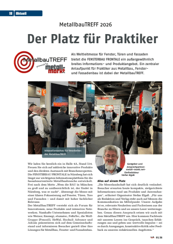 MetallbauTREFF 2026Der Platz f%u00fcr PraktikerAls Weltleitmesse f%u00fcr Fenster, T%u00fcren und Fassaden bietet die FENSTERBAU FRONTALE ein au%u00dfergew%u00f6hnlich breites Informations- und Produktangebot. Ein zentraler Anlaufpunkt f%u00fcr Praktiker aus Metallbau, Fensterund Fassadenbau ist dabei der MetallbauTREFF.Wir laden Sie herzlich ein in Halle 4A, Stand 514. Freuen Sie sich auf zahlreiche innovative Produkte und den direkten Austausch mit Branchenexperten. Die FENSTERBAU FRONTALE in N%u00fcrnberg hat sich l%u00e4ngst zur wichtigsten Informationsplattform f%u00fcr die fassadenorientierte Metallbaubranche entwickelt. Frei nach dem Motto %u201eWem die BAU in M%u00fcnchen zu gro%u00df und zu un%u00fcbersichtlich ist, der findet in N%u00fcrnberg, was er sucht%u201c, %u00fcberzeugt die Messe mit einer klaren Fokussierung auf Fenster, T%u00fcren, Tore und Fassaden %u2013 und damit mit hoher fachlicher Relevanz.Der MetallbauTREFF versteht sich als Forum f%u00fcr Innovationen, neue Produkte und intensives Netzwerken. Namhafte Unternehmen und Spezialisten wie Weinor, Emmegi, elumatec, FeBaTec, die WolfGruppe (Penosil), HeWal, Hochuli Advance und Adcom pr%u00e4sentieren sich auf dem Gemeinschaftsstand und informieren Besucher gezielt %u00fcber ihre L%u00f6sungen f%u00fcr Metallbau, Fenster- und Fassadenbau.Alles auf einem Platz%u201eDie Messelandschaft hat sich deutlich ver%u00e4ndert. Besucher erwarten heute kompakte, zielgerichtete Informationen rund um Produkte und Anwendungen%u201c, erl%u00e4utert Organisator Stefan Elga%u00df. %u201eF%u00fcr uns als Redaktion und Verlag steht auch auf Messen die Kommunikation im Mittelpunkt. Unsere Aufgabe ist es, relevante Neuheiten und Fachwissen aus der Branche zu filtern und an unsere Leser weiterzugeben. Genau diesen Anspruch setzen wir auch mit dem MetallbauTREFF um. Hier kommen Fachleute mit unseren Lesern ins Gespr%u00e4ch, tauschen Erfahrungen aus und geben uns wertvolle Impulse %u2013 sei es durch Anregungen, konstruktive Kritik oder Feedback zu unseren redaktionellen Angeboten.%u201cGastgeber und Ansprechpartner: metall-markt.netChefredakteur Stefan Elga%u00df18 Aktuell01|26Innovationsschau f%u00fcr Verarbeiter: der MetallbauTREFF