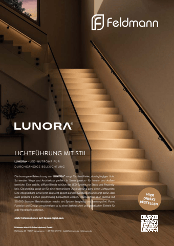 LICHTF%u00dcHRUNG MIT STILLUNORA%u00ae %u2013L E D-N U T R O H R F %u00dc R DURCHG%u00c4NGIGE BELEUCHTUNGDie homogene Beleuchtung von LUNORA%u00ae sorgt f%u00fcr blendfreies, durchg%u00e4ngiges Licht. So werden Wege und Architektur perfekt in Szene gesetzt- f%u00fcr Innen- und Au%u00dfenbereiche. Eine stabile, diffuse Blende sch%u00fctzt das LED-System vor Staub und Feuchtigkeit. Gleichzeitig sorgt sie f%u00fcr eine harmonische Ausleuchtung ganz ohne Lichtpunkte. Eine integrierbare Linse lenkt das Licht gezielt auf den Gehbereich und sorgt daf%u00fcr, dass auch gr%u00f6%u00dfere Fl%u00e4chen gleichm%u00e4%u00dfig beleuchtet werden. Hochwertige LED-Technik mit 50.000 Stunden Betriebsdauer macht das System langlebig und wartungsfrei. Form, Funktion und Design verschmelzen so zu einer %u00e4sthetischen und praktischen Einheit f%u00fcr jede Handlaufinstallation.Mehr Informationen auf: lunora-light.comFeldmann Metall & Schmiedekunst GmbH %u00b7M%u00fchlsteig 25 %u00b7 90579 Langenzenn %u00b7 +49 9101 4977-0 %u00b7 led@feldmann.de %u00b7 feldmann.deHIER DIREKT BESTELLEN