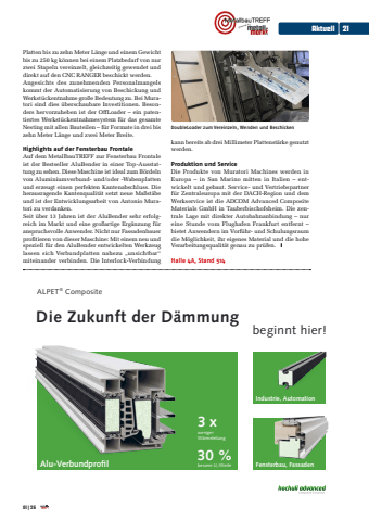Aktuell 2101| 26Platten bis zu zehn Meter L%u00e4nge und einem Gewicht bis zu 250 kg k%u00f6nnen bei einem Platzbedarf von nur zwei Stapeln vereinzelt, gleichzeitig gewendet und direkt auf den CNC RANGER beschickt werden.Angesichts des zunehmenden Personalmangels kommt der Automatisierung von Beschickung und Werkst%u00fcckentnahme gro%u00dfe Bedeutung zu. Bei Muratori sind dies %u00fcberschaubare Investitionen. Besonders hervorzuheben ist der OffLoader %u2013 ein patentiertes Werkst%u00fcckentnahmesystem f%u00fcr das gesamte Nesting mit allen Bauteilen %u2013 f%u00fcr Formate in drei bis zehn Meter L%u00e4nge und zwei Meter Breite.Highlights auf der Fensterbau FrontaleAuf dem MetallbauTREFF zur Fensterbau Frontale ist der Bestseller AluBender in einer Top-Ausstattung zu sehen. Diese Maschine ist ideal zum B%u00f6rdeln von Aluminiumverbund- und/oder -Wabenplatten und erzeugt einen perfekten Kantenabschluss. Die herausragende Kantenqualit%u00e4t setzt neue Ma%u00dfst%u00e4be und ist der Entwicklungsarbeit von Antonio Muratori zu verdanken. Seit %u00fcber 13 Jahren ist der AluBender sehr erfolgreich im Markt und eine gro%u00dfartige Erg%u00e4nzung f%u00fcr anspruchsvolle Anwender. Nicht nur Fassadenbauer profitieren von dieser Maschine: Mit einem neu und speziell f%u00fcr den AluBender entwickelten Werkzeug lassen sich Verbundplatten nahezu %u201eunsichtbar%u201c miteinander verbinden. Die Interlock-Verbindung kann bereits ab drei Millimeter Plattenst%u00e4rke genutzt werden.Produktion und ServiceDie Produkte von Muratori Machines werden in Europa %u2013 in San Marino mitten in Italien %u2013 entwickelt und gebaut. Service- und Vertriebspartner f%u00fcr Zentraleuropa mit der DACH-Region und dem Werkservice ist die ADCOM Advanced Composite Materials GmbH in Tauberbischofsheim. Die zentrale Lage mit direkter Autobahnanbindung %u2013 nur eine Stunde vom Flughafen Frankfurt entfernt %u2013 bietet Anwendern im Vorf%u00fchr- und Schulungsraum die M%u00f6glichkeit, ihr eigenes Material und die hohe Verarbeitungsqualit%u00e4t genau zu pr%u00fcfen. yHalle 4A, Stand 514 Alu-VerbundprofilDie Zukunft der D%u00e4mmung beginnt hier!ALPET%u00ae CompositeIndustrie, AutomationFensterbau, Fassaden3 x30 %weniger W%u00e4rmeleitung bessere Uf-WerteDoubleLoader zum Vereinzeln, Wenden und Beschicken