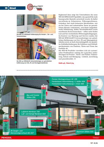 Erg%u00e4nzend dazu zeigt das Unternehmen das neue WD-40-SPECIALIST-Spr%u00fchfett, das speziell f%u00fcr stark beanspruchte Bauteile entwickelt wurde. Es haftet zuverl%u00e4ssig an Scharnieren, F%u00fchrungsschienen, Gelenken und stark belasteten Mechaniken, wie sie bei T%u00fcren und industriellen Toren im gewerblichen Einsatz vorkommen, und bietet langanhaltende Schmierung, hohen Verschlei%u00dfschutz sowie exzellenten Korrosionsschutz %u2013 selbst unter hoher Last und bei wechselnden Witterungsbedingungen.Im Kontext von Wartung und Service runden der WD-40 SPECIALIST-Universalreiniger zur gr%u00fcndlichen Entfernung von Fett, %u00d6l und Montager%u00fcckst%u00e4nden sowie, je nach Anwendungsfall, ein spezielles Schlie%u00dfzylinderspray f%u00fcr Schl%u00f6sser und Schlie%u00dfmechanismen von Fenstern, T%u00fcren und Toren das Portfolio ab.Die WD-40 Produkte verstehen sich als systemischer Probleml%u00f6ser entlang der typischen Anforderungen im Fenster-, T%u00fcren- und Torbau: Schmierung, Schutz und Reinigung %u2013 einfach, zuverl%u00e4ssig und praxisbew%u00e4hrt. yHalle 4A, Stand 514Das WD-40-SPECIALIST-Silikonspray f%u00fcr Fenster-, T%u00fcr- und TormechanikenDer WD-40 SPECIALIST-Universalreiniger zur gr%u00fcndlichen Entfernung von Fett, %u00d6l und Montager%u00fcckst%u00e4nden28 Aktuell01|26