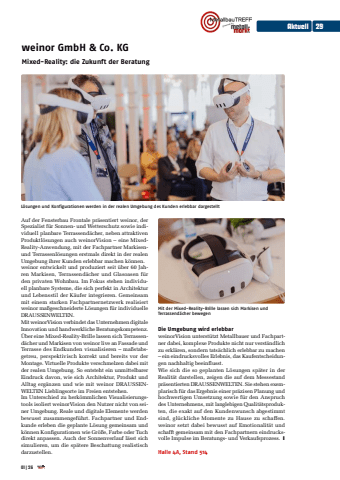 weinor GmbH & Co. KG Mixed-Reality: die Zukunft der BeratungAuf der Fensterbau Frontale pr%u00e4sentiert weinor, der Spezialist f%u00fcr Sonnen- und Wetterschutz sowie individuell planbare Terrassend%u00e4cher, neben attraktiven Produktl%u00f6sungen auch weinorVision %u2013 eine MixedReality-Anwendung, mit der Fachpartner Markisenund Terrassenl%u00f6sungen erstmals direkt in der realen Umgebung ihrer Kunden erlebbar machen k%u00f6nnen.weinor entwickelt und produziert seit %u00fcber 60 Jahren Markisen, Terrassend%u00e4cher und Glasoasen f%u00fcr den privaten Wohnbau. Im Fokus stehen individuell planbare Systeme, die sich perfekt in Architektur und Lebensstil der K%u00e4ufer integrieren. Gemeinsam mit einem starken Fachpartnernetzwerk realisiert weinor ma%u00dfgeschneiderte L%u00f6sungen f%u00fcr individuelle DRAUSSENWELTEN.Mit weinorVision verbindet das Unternehmen digitale Innovation und handwerkliche Beratungskompetenz. %u00dcber eine Mixed-Reality-Brille lassen sich Terrassend%u00e4cher und Markisen von weinor live an Fassade und Terrasse des Endkunden visualisieren %u2013 ma%u00dfstabsgetreu, perspektivisch korrekt und bereits vor der Montage. Virtuelle Produkte verschmelzen dabei mit der realen Umgebung. So entsteht ein unmittelbarer Eindruck davon, wie sich Architektur, Produkt und Alltag erg%u00e4nzen und wie mit weinor DRAUSSENWELTEN Lieblingsorte im Freien entstehen.Im Unterschied zu herk%u00f6mmlichen Visualisierungstools isoliert weinorVision den Nutzer nicht von seiner Umgebung. Reale und digitale Elemente werden bewusst zusammengef%u00fchrt. Fachpartner und Endkunde erleben die geplante L%u00f6sung gemeinsam und k%u00f6nnen Konfigurationen wie Gr%u00f6%u00dfe, Farbe oder Tuch direkt anpassen. Auch der Sonnenverlauf l%u00e4sst sich simulieren, um die sp%u00e4tere Beschattung realistisch darzustellen. Die Umgebung wird erlebbarweinorVision unterst%u00fctzt Metallbauer und Fachpartner dabei, komplexe Produkte nicht nur verst%u00e4ndlich zu erkl%u00e4ren, sondern tats%u00e4chlich erlebbar zu machen %u2013 ein eindrucksvolles Erlebnis, das Kaufentscheidungen nachhaltig beeinflusst.Wie sich die so geplanten L%u00f6sungen sp%u00e4ter in der Realit%u00e4t darstellen, zeigen die auf dem Messestand pr%u00e4sentierten DRAUSSENWELTEN. Sie stehen exemplarisch f%u00fcr das Ergebnis einer pr%u00e4zisen Planung und hochwertigen Umsetzung sowie f%u00fcr den Anspruch des Unternehmens, mit langlebigen Qualit%u00e4tsprodukten, die exakt auf den Kundenwunsch abgestimmt sind, gl%u00fcckliche Momente zu Hause zu schaffen. weinor setzt dabei bewusst auf Emotionalit%u00e4t und schafft gemeinsam mit den Fachpartnern eindrucksvolle Impulse im Beratungs- und Verkaufsprozess. yHalle 4A, Stand 514L%u00f6sungen und Konfigurationen werden in der realen Umgebung des Kunden erlebbar dargestelltMit der Mixed-Reality-Brille lassen sich Markisen und Terrassend%u00e4cher bewegenAktuell 2901| 26
