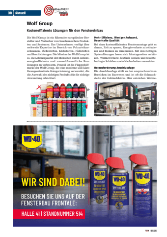 Wolf GroupKosteneffiziente L%u00f6sungen f%u00fcr den FenstereinbauDie Wolf Group ist ein f%u00fchrender europ%u00e4ischer Hersteller und Vertreiber von bauchemischen Produkten und Systemen. Das Unternehmen verf%u00fcgt %u00fcber weltweite Expertise im Bereich von Polyurethansch%u00e4umen, Dichtstoffen, Klebstoffen, F%u00fcllstoffen und Beschichtungen. Die Mission der Wolf Group ist es, die Lebensqualit%u00e4t der Menschen durch sichere, energieeffiziente und umweltfreundliche Baul%u00f6sungen zu verbessern. Penosil ist die Flaggschiffmarke der Wolf Group, die eine moderne und klare l%u00f6sungsorientierte Kategorisierung verwendet, die die Auswahl des richtigen Produkts f%u00fcr die richtige Anwendung erleichtert.Mehr Effizienz. Weniger Aufwand. Dauerhafte Qualit%u00e4tBei einer kosteneffizienten Fenstermontage geht es darum, Zeit zu sparen, Energieverluste zu reduzieren und Risiken zu minimieren. Mit den richtigen Systeml%u00f6sungen lassen sich Montagezeiten verk%u00fcrzen, W%u00e4rmeverluste deutlich senken und feuchtebedingte Sch%u00e4den sowie Nacharbeiten vermeiden.Herausforderung AnschlussfugeDie Anschlussfuge z%u00e4hlt zu den anspruchsvollsten Bereichen im Bauwesen und ist oft die Schwachstelle der Geb%u00e4udeh%u00fclle. Hier entstehen W%u00e4rmeFotos: Wolf GroupHALLE 41 | STANDNUMMER 514WDC_26_0001_AZ_Fensterbau_Frontale_180x126mm_RZ_V1.indd 1 21.01.26 11:2330 Aktuell01|26