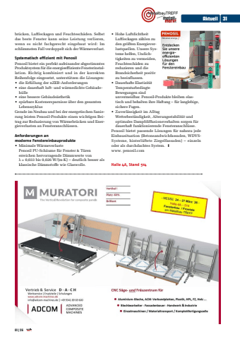 br%u00fccken, Luftleckagen und Feuchtesch%u00e4den. Selbst das beste Fenster kann seine Leistung verlieren, wenn es nicht fachgerecht eingebaut wird: Im schlimmsten Fall verdoppelt sich der W%u00e4rmeverlust.Systematisch effizient mit PenosilPenosil bietet ein perfekt aufeinander abgestimmtes Produktsystem f%u00fcr die energieeffiziente Fensterinstallation. Richtig kombiniert und in der korrekten Reihenfolge eingesetzt, unterst%u00fctzen die L%u00f6sungen:%u2022 die Erf%u00fcllung der nZEB-Anforderungen%u2022 eine dauerhaft luft- und w%u00e4rmedichte Geb%u00e4udeh%u00fclle%u2022 eine bessere Geb%u00e4ude%u00e4sthetik%u2022 sp%u00fcrbare Kostenersparnisse %u00fcber den gesamten LebenszyklusGerade im Neubau und bei der energetischen Sanierung leisten Penosil-Produkte einen wichtigen Beitrag zur Reduzierung von W%u00e4rmebr%u00fccken und Energieverlusten an Fensteranschl%u00fcssen. Anforderungen an moderne Fenstereinbauprodukte%u2022 Minimale W%u00e4rmeverlustePenosil PU-Sch%u00e4ume f%u00fcr Fenster & T%u00fcren erreichen hervorragende D%u00e4mmwerte von%u03bb = 0,033 bis 0,026 W/(m%u00b7K) %u2013 deutlich besser als klassische D%u00e4mmstoffe wie Glaswolle.%u2022 Hohe LuftdichtheitLuftleckagen z%u00e4hlen zu den gr%u00f6%u00dften Energieverlustquellen. Unsere Systeme helfen, Undichtigkeiten zu vermeiden, Feuchtesch%u00e4den zu reduzieren und die Brandsicherheit positiv zu beeinflussen.%u2022 Dauerhafte Elastizit%u00e4tTemperaturbedingte Bewegungen sind unvermeidbar. Penosil-Produkte bleiben elastisch und behalten ihre Haftung %u2013 f%u00fcr langlebige, sichere Fugen.%u2022 Zuverl%u00e4ssigkeit im AlltagWetterbest%u00e4ndigkeit, Alterungsstabilit%u00e4t und optimales Dampfdiffusionsverhalten sorgen f%u00fcr dauerhaft funktionierende Fensteranschl%u00fcsse.Penosil bietet passende L%u00f6sungen f%u00fcr nahezu jede Einbausituation (Betonsandwichfassaden, WDVSSysteme, hinterl%u00fcftete Ziegelfassaden) %u2013 einzeln oder als durchdachtes System. ywww. penosil.comHalle 4A, Stand 514Aktuell 3101| 26