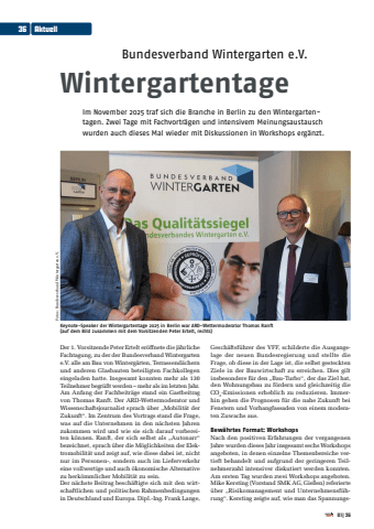 Bundesverband Wintergarten e.V.WintergartentageIm November 2025 traf sich die Branche in Berlin zu den Wintergartentagen. Zwei Tage mit Fachvortr%u00e4gen und intensivem Meinungsaustausch wurden auch dieses Mal wieder mit Diskussionen in Workshops erg%u00e4nzt. Der 1. Vorsitzende Peter Ertelt er%u00f6ffnete die j%u00e4hrliche Fachtagung, zu der der Bundesverband Wintergarten e.V. alle am Bau von Winterg%u00e4rten, Terrassend%u00e4chern und anderen Glasbauten beteiligten Fachkollegen eingeladen hatte. Insgesamt konnten mehr als 130 Teilnehmer begr%u00fc%u00dft werden %u2013 mehr als im letzten Jahr. Am Anfang der Fachbeitr%u00e4ge stand ein Gastbeitrag von Thomas Ranft. Der ARD-Wettermoderator und Wissenschaftsjournalist sprach %u00fcber %u201eMobilit%u00e4t der Zukunft%u201c. Im Zentrum des Vortrags stand die Frage, was auf die Unternehmen in den n%u00e4chsten Jahren zukommen wird und wie sie sich darauf vorbereiten k%u00f6nnen. Ranft, der sich selbst als %u201eAutonarr%u201c bezeichnet, sprach %u00fcber die M%u00f6glichkeiten der Elektromobilit%u00e4t und zeigt auf, wie diese dabei ist, nicht nur im Personen-, sondern auch im Lieferverkehr eine vollwertige und auch %u00f6konomische Alternative zu herk%u00f6mmlicher Mobilit%u00e4t zu sein. Der n%u00e4chste Beitrag besch%u00e4ftigte sich mit den wirtschaftlichen und politischen Rahmenbedingungen in Deutschland und Europa. Dipl.-Ing. Frank Lange, Gesch%u00e4ftsf%u00fchrer des VFF, schilderte die Ausgangslage der neuen Bundesregierung und stellte die Frage, ob diese in der Lage ist, die selbst gesteckten Ziele in der Bauwirtschaft zu erreichen. Dies gilt insbesondere f%u00fcr den %u201eBau-Turbo%u201c, der das Ziel hat, den Wohnungsbau zu f%u00f6rdern und gleichzeitig die CO2-Emissionen erheblich zu reduzieren. Immerhin gehen die Prognosen f%u00fcr die nahe Zukunft bei Fenstern und Vorhangfassaden von einem moderaten Zuwachs aus. Bew%u00e4hrtes Format: WorkshopsNach den positiven Erfahrungen der vergangenen Jahre wurden dieses Jahr insgesamt sechs Workshops angeboten, in denen einzelne Themenbereiche vertieft behandelt und aufgrund der geringeren Teilnehmerzahl intensiver diskutiert werden konnten. Am ersten Tag wurden zwei Workshops angeboten.Mike Kersting (Vorstand SMK AG, Gie%u00dfen) referierte %u00fcber %u201eRisikomanagement und Unternehmensf%u00fchrung%u201c. Kersting zeigte auf, wie man das SpannungsKeynote-Speaker der Wintergartentage 2025 in Berlin war ARD-Wettermoderator Thomas Ranft (auf dem Bild zusammen mit dem Vorsitzenden Peter Ertelt, rechts)Fotos: Bundesverband Wintergarten e.V.36 Aktuell01|26