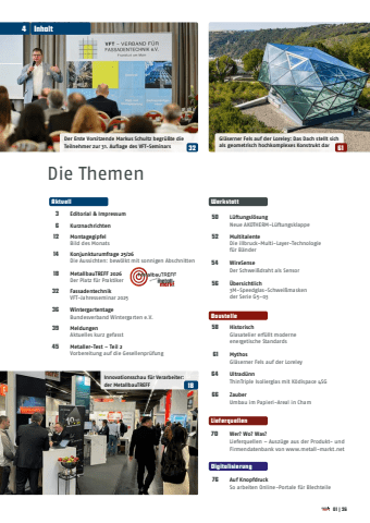 Die ThemenAktuell3 Editorial & Impressum6 Kurznachrichten12 Montagegipfel Bild des Monats14 Konjunkturumfrage 25/26 Die Aussichten: bew%u00f6lkt mit sonnigen Abschnitten18 MetallbauTREFF 2026 Der Platz f%u00fcr Praktiker 32 Fassadentechnik VFT-Jahresseminar 202536 Wintergartentage Bundesverband Wintergarten e.V.39 Meldungen Aktuelles kurz gefasst45 Metaller-Test %u2013 Teil 2 Vorbereitung auf die Gesellenpr%u00fcfungWerkstatt50 L%u00fcftungsl%u00f6sung Neue AKOTHERM-L%u00fcftungsklappe52 Multitalente Die illbruck-Multi-Layer-Technologie f%u00fcr B%u00e4nder54 WireSense Der Schwei%u00dfdraht als Sensor 56 %u00dcbersichtlich 3M-Speedglas-Schwei%u00dfmasken der Serie G5-03Baustelle58 Historisch Glasatelier erf%u00fcllt moderne energetische Standards61 Mythos Gl%u00e4serner Fels auf der Loreley64 Ultrad%u00fcnn ThinTriple Isolierglas mit K%u00f6dispace 4SG66 Zauber Umbau im Papieri-Areal in ChamLieferquellen70 Wer? Wo? Was? Lieferquellen %u2013 Ausz%u00fcge aus der Produkt- und Firmendatenbank von www.metall-markt.netDigitalisierung76 Auf Knopfdruck So arbeiten Online-Portale f%u00fcr BlechteileDer Erste Vorsitzende Markus Schultz begr%u00fc%u00dfte die Teilnehmer zur 31. Auflage des VFT-Seminars 32 61Gl%u00e4serner Fels auf der Loreley: Das Dach stellt sich als geometrisch hochkomplexes Konstrukt darInnovationsschau f%u00fcr Verarbeiter: der MetallbauTREFF 18401|26Inhalt