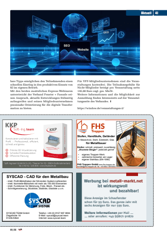 bare Tipps erm%u00f6glichen den Teilnehmenden einen schnellen Einstieg in den produktiven Einsatz von KI im eigenen Betrieb.Mit den beiden zus%u00e4tzlichen Express-Webinaren unterstreicht der Verband Fenster + Fassade seinen Anspruch, aktuelle Entwicklungen fr%u00fchzeitig aufzugreifen und seinen Mitgliedsunternehmen praxisnahe Orientierung f%u00fcr die digitale Transformation zu bieten.F%u00fcr VFF-Mitgliedsunternehmen sind die Veranstaltungen kostenfrei. Die Teilnahmegeb%u00fchr f%u00fcr Nicht-Mitglieder betr%u00e4gt pro Veranstaltung netto 195,00 Euro zzgl. ges. MwSt.Weitere Informationen und die M%u00f6glichkeit zur Anmeldung finden Interessierte auf der Veranstaltungsseite des Verbandes. yhttps://window.de/veranstaltungen-2/Wintergartenplanungs- und Kalkulations-SoftwareSoft-Ing-Team GmbH & Co. KGWintergartenplanungs- und Kalkulations-Software6WXIHQ%u000f%u0003+DQGOlXIH%u000f%u0003*HOlQGHU%u00c4.UXPPH%u0003'LQJHU%u00b3ffl%u0003MHGHU]HLW%u0003JHUQH%u00046WXIHQffl%u0003VFKQHOO%u000f%u0003SUHLVZHUW%u000f%u0003]XYHUOlVVLJ%u0178 ]DKOUHLFKH%u0003+RO]DUWHQ%u0003DP%u0003/DJHU%u0178 HLJHQHV%u00037UHSSHQ%u0010:HUN%u0178 HLJHQHU%u00036WDKOEDX%u0003%u000b(1%u0010%u0014%u0013ffi%u0013%u000cTreppenLQ%u00030DVVLYKRO]%u000f%u00036WDKO%u000f%u0003(GHOVWDKO%u000f%u0003*ODVI%u0081U%u00030HWDOOEDXHUNRQWDNW#IKV%u0010WUHSSHQ%u0011GH%u00037HO%u0011%u0003%u000e%u0017ffi%u0003fl%u0019%u0017%u0014%u0003%u0019ffi%u001a%u0013fl%u0016%u0016)+6%u00037UHSSHQ%u0003*PE+ ZZZ%u0011IKV%u0010WUHSSHQ%u0011GHSYSCAD TEAM GmbHZiegelh%u00fctte 1891236 AlfeldTelefon: +49 (0) 9157 997 9994E-Mail: syscad@syscad.teamInternet: www.syscad.teamSYSCAD - CAD f%u00fcr den Metallbau- intell. Profil-Bibliotheken der f%u00fchrenden System-Lieferanten - intell. Normteile-Bibliothek mit mehr als 100.000 Elementen- intell. Funktionen f%u00fcr D%u00e4mmung, Folie, Blech, Paneel etc.- Schnittgenerierung, St%u00fcckliste, Stabliste, Glasliste u.v.m.Werbung bei metall-markt.net ist wirkungsvoll und bezahlbar!Diese Anzeige im Schaufenster schon f%u00fcr 99 Euro. Das ganze Jahr mit sechs Anzeigen f%u00fcr nur 599 Euro.Weitere Informationen per Mail %u2026%u2026 oder anrufen: +49 (0)8171 911870Aktuell 4101| 26