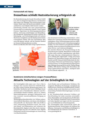 Partnerschaft mit Fabory Dresselhaus schlie%u00dft Restrukturierung erfolgreich abDie Restrukturierung der Joseph Dresselhaus GmbH & Co. KG ist erfolgreich abgeschlossen. Im Dezember 2025 haben die Gl%u00e4ubiger dem Insolvenzplan zugestimmt. Damit kann das Insolvenzverfahren voraussichtlich bis zum Fr%u00fchjahr 2026 beendet werden. Gleichzeitig entsteht eine neue paneurop%u00e4ische Partnerschaft im technischen Handel: Torqx Capital Partners, Eigent%u00fcmer des Befestigungsspezialisten Fabory, wird neuer Anteilseigner von Dresselhaus. Die strategische Verbindung der beiden Anbieter f%u00fcr Befestigungs- und Verbindungstechnik soll weiteres Wachstum erm%u00f6glichen und die Marktposition beider Unternehmen st%u00e4rken. Wie das Unternehmen %u00fcber seine PR-Agentur mitteilt, soll der Standort Herford im Sommer 2026 geschlossen werden.Bereits im Oktober 2025 hatte Torqx Capital Partners Hat das Insolvenzverfahren erfolgreich abgeschlossen: CEO Markus Sch%u00f6rgeine Investorenvereinbarung unterzeichnet, vorbehaltlich der Umsetzung zentraler Restrukturierungsma%u00dfnahmen. Diese Voraussetzungen sind nun erf%u00fcllt. Metallbauer profitieren nach Unternehmensangaben k%u00fcnftig von einer breiteren europ%u00e4ischen Marktabdeckung, einem erweiterten Produktsortiment sowie hoher Service- und Lieferzuverl%u00e4ssigkeit. Ein zentrales Element der Neuausrichtung ist die Neuordnung der Logistik. Warenfl%u00fcsse werden k%u00fcnftig %u00fcber einen externen Logistikpartner nahe Bielefeld sowie %u00fcber das vollautomatisierte Fabory-Lager in Tilburg (NL) abgewickelt. Lemgo wird neuer Hauptsitz der Dresselhaus-Gruppe und Standort f%u00fcr Handel und DIY. Maisach bleibt Drehscheibe f%u00fcr S%u00fcddeutschland, %u00d6sterreich und S%u00fcdosteuropa. Begleitet wird der Prozess von den Restrukturierungsexperten Marc-Philippe Hornung (SZA) und Dr. Thomas Rieger (G%u00d6RG). CEO Markus Sch%u00f6rg sieht Dresselhaus mit Torqx Capital Partners und Fabory %u201estrategisch stark f%u00fcr die Zukunft aufgestellt%u201c. yErstes Ergebnis des Zusammenschlusses: Der Standort Herford wird geschlossenKombinierte Schleifverfahren steigern ProzesseffizienzAktuelle Technologien auf der GrindingHub im MaiDie GrindingHub 2026 zeigt vom 5. bis 8. Mai in Stuttgart den neuesten Stand der Schleiftechnik. Im Fokus stehen hybride Bearbeitungssysteme, die Schleifen, Erodieren und Lasern intelligent kombinieren und so Produktivit%u00e4t, Pr%u00e4zision und Prozessstabilit%u00e4t deutlich erh%u00f6hen. Ziel ist es, h%u00f6here Materialabtragsraten, geringere Nebenzeiten und eine vernetzte, ressourceneffiziente Fertigung zu realisieren.Werkzeugmaschinenhersteller wie Vollmer pr%u00e4sentieren hybride Maschinen, mit denen sich ultraharte Schneidstoffe wie Hartmetall, PKD oder PcBN in einer Aufspannung bearbeiten lassen. Das reduziert Haupt- und Nebenzeiten und verbessert die Bauteilqualit%u00e4t. Erg%u00e4nzt wird dies durch Automationsl%u00f6sungen f%u00fcr den 24/7-Betrieb sowie digitale Plattformen und KI-Anwendungen zur Auswertung von Maschinendaten.Auch Studer setzt auf kombinierte Verfahren: Die integrierte WireDress-Technologie erm%u00f6glicht das elektroerosive Abrichten metallgebundener Schleifscheiben direkt in der Maschine und erzielt je nach Anwendung Produktivit%u00e4tssteigerungen von bis zu 70 Prozent.In der Verzahntechnik adressiert Liebherr mit SkiveFinishing die L%u00fccke zwischen wirtschaftlichem Hartsch%u00e4len und hochpr%u00e4zisem Profilschleifen. Das Verfahren kombiniert kurze Prozesszeiten mit hoher Qualit%u00e4t und eignet sich f%u00fcr Anwendungen von E-Mobilit%u00e4t bis Schwerlastgetriebe.Die GrindingHub 2026 unterstreicht damit die Bedeutung hybrider Technologien als Schl%u00fcssel f%u00fcr Effizienz, Automation und Wettbewerbsf%u00e4higkeit in der Schleiftechnik der n%u00e4chsten Generation. ywww.grindinghub.de42 Aktuell01|26